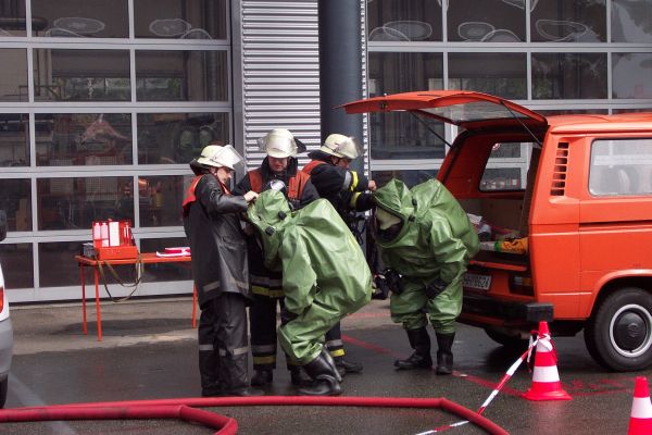 Hierbei stellte sich heraus, dass der für solch eine Schadenslage erforderliche Kommunikationsaustausch zwischen dem Erkunder an der EST und der Übungszentrale sehr erheblich war. Für die Erkundung der Flüssigkeit wurde die FF Bramfeld unter Anwendung von CSA`s eingesetzt. Zeitgleich wurde eine DEKON Reinigungszone mit den notwendigen Reinigungszonen von der FF Wellingsbüttel eingerichtet.