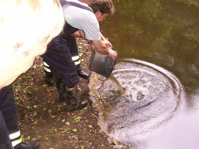 Als die Duvenstedter an der Einsatzstelle ankamen, waren bereits ungefähr 200 Rotaugen durch den Wassermangel gestorben. Weitere 50 Rotaugen und Kaulquappen lebten noch. Da es aufgrund der großen Wärme keine gesicherte Möglichkeit gab, das Becken für einen längeren Zeitraum wieder mit Wasser zu befüllen, wurden die Fische einzeln eingesammelt.