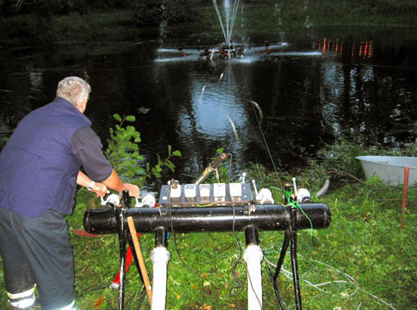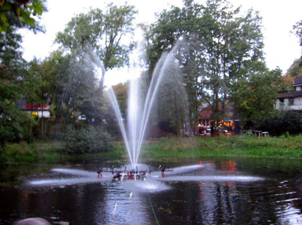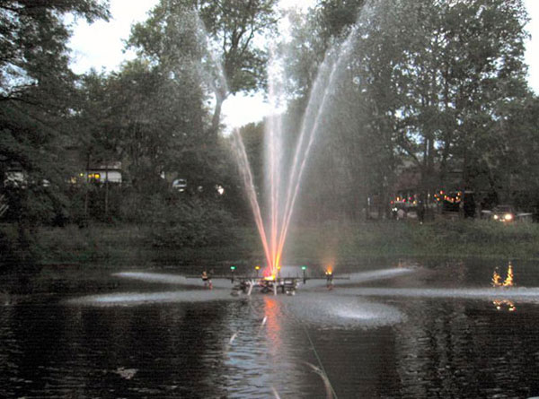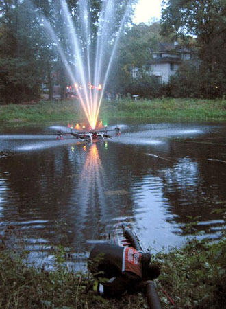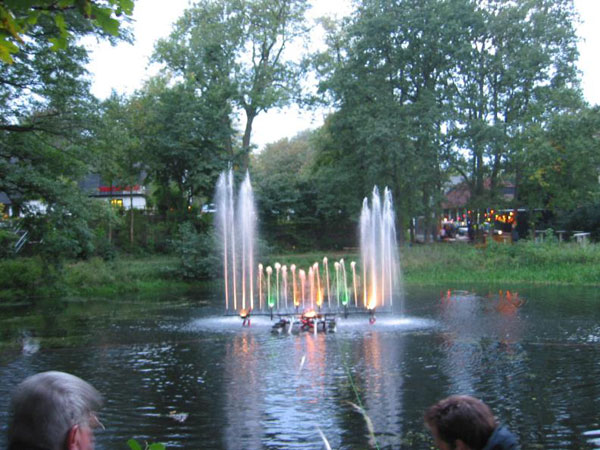 Dort wartete bereits die bekannte Wassserlichtorgel auf ihren Auftritt. Angetrieben von einer TS 8/8 steuerten Angehörige der FF lauter verschiedene Figuren, farbig beleuchtet, in die Luft, von klassischer und populärer Musik begleitet.
