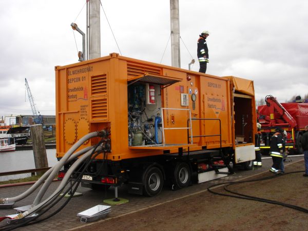 Die Kräfte der Feuerwehr hatten zwischenzeitlich ihren Aufgabenbereich ebenfalls aufgeteilt. Die FF Warwisch verlegte Hydraulik- und Cargo-Schlauchleitungen zwischen Pumpen, Steuerstand und SEPCON und bereite alles für die Separation vor. Die FF Fünfhausen baute den 70 m³-Vorlagetank, einen 30 m³-Tankbehälter (für das separierte Öl) sowie das Lamor Skimmersystem mit Power-Pack, Hydraulik- und Schlauchleitungen auf und beschickten den von den Warwischern betriebsbereit gemachten SEPCON mit Wasser. Der Lamor-Skimmer wurde vom THW-Kran aufgenommen und im Ölsperrenbereich zu Wasser gelassen. Er beschickte den 70m³-Vorlagentank mit dem angenommenen Öl/Wassergemisch. Mit einer vom SEPCON betriebenen zusätzlichen Hydraulikpumpe wurde vom THW-Falttank das dort gesammelte Öl/Wassergemisch abgeholt und ebenfalls in den 70 m³-Vorlagentank gefördert. Mittels einer 100m³/h-Hydraulikpumpe wurde dann der SEPCON aus dem Vorlagentank beschickt. Vom Steuerstand wurde in Absprache mit dem Maschinenführer des SEPCON sowie den Überwachungskräften von Vorlagentank, Lamor-Skimmer und THW-Falttank die Separation gefahren. Aufgrund der räumlichen Entfernungen und des Geräuschpegels musste dies über Handsprechfunkgeräte erfolgen.