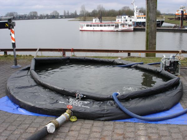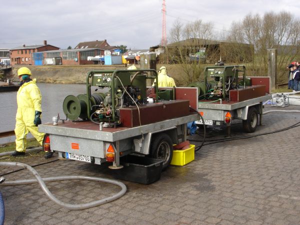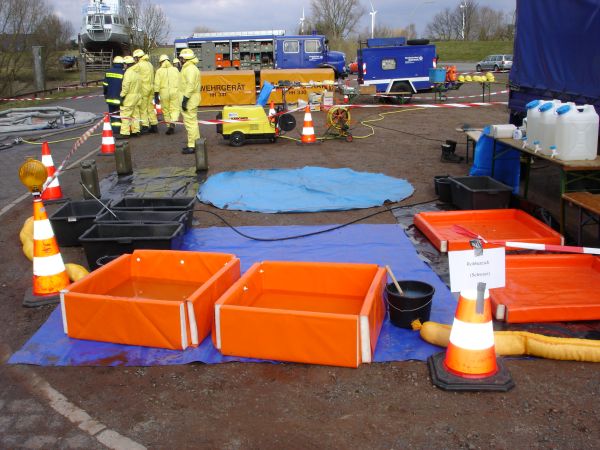 Das THW brachte eine 100 m lange Ölsperre (Hydrotec) zu Wasser und verankerte sie fachgerecht. 2 Trogskimmer und 1 Handskimmer (zwecks Aufnahme des Öl/Wassergemisches) kamen zum Einsatz. Mit Hilfe eines THW-Kranes wurden zwei Pontons, ein Schlauchboot sowie ein Rettungs- und Sicherungsboot zu Wasser gelassen. Parallel dazu wurden an Land zwei 15m³ fassende Falttanks errichtet; in die das von den drei eingesetzten Skimmern abgeschöpfte Öl-Wasser-Gemisch gesammelt wurde. Mittels Dampfstrahlern wurde die angenommene Öldekontamination der Kaianlage gereinigt. Für die Reinigung von Personal und Gerät wurde ein Dekontaminationsbereich mit den Trennbereichen weiß/grau/schwarz eingerichtet. Das abgeskimmte Öl/Wassergemisch wurde in Falttanks zwischengelagert und sollte dort von der Feuerwehr für die Separation im SEPCON abgenommen werden.