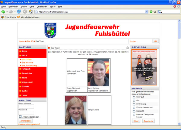 Die Jugendfeuerwehr Fuhlsbüttel hat seit kurzem eine neue Internetpräsenz. Unter http://www.jf-fuhlsbuettel.de.vu haben interessierte Gäste die Möglichkeit, sich über die Aktivitäten der Jugendfeuerwehr Fuhlsbüttel zu informieren.