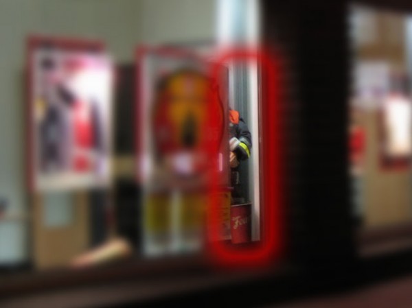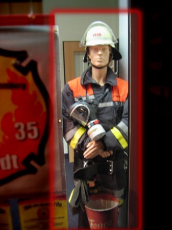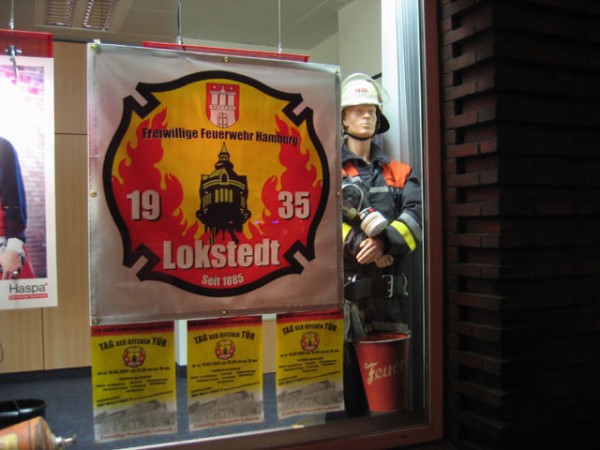 Stimmt. Wie ein Feuerwehrmann. Nur ist dies ein Modell eines Feuerwehrkameraden. Aber warum steht dieses Modell in einer Haspa-Filliale?