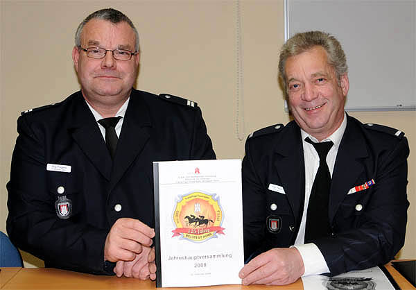 Pünktlich zum Jubiläum stellten Wehrführer Jörg Plagens und sein Vertreter Ingo Hagemann das von Janine Lux entworfene Jubiläumslogo im Rahmen der Jahreshauptversammlung vor.