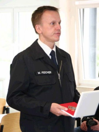 Der Marburger Brandoberamtsrat Wernder Fischer verlieh ein paar Stunden zuvor dem Wehrführer David-Benjamin Märtig in der Hauptfeuerwache das „Bronzene Helmschild“ der Feuerwehr Marburg. Damit ehrte die Stadt Marburg das langjährige und persönliche Engagement des Hamburger Wehrführers um die Kameradschaft zur Marburger Feuerwehr. Diese Partnerschaft ist nunmehr seit fast 30 Jahren von außerordentlichem kameradschaftlichen Engagement so geprägt, dass sie inzwischen zu einer wahren Freundschaft gewachsen ist.