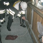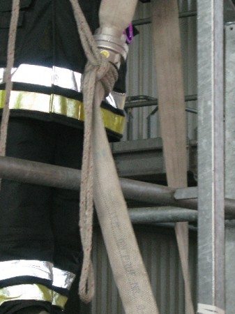 Das Aufstellen von Steckleiter und Schiebleiter wurde noch einmal aus Sicht der Landesfeuerwehrschule dargestellt und geübt, da hierbei vielfach Fehler während der Truppmannprüfung geschehen. Es wurden auch die hierzu erforderlichen Stiche und Bunde nochmals erläutert. Gezeigte Tips und Tricks sollen den Ausbildern helfen, den Anwärtern das Binden der erforderlichen Stiche und Bunde besser beizubringen.