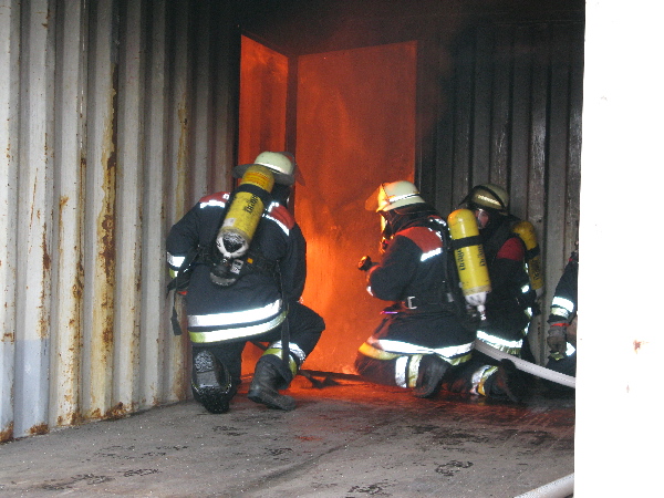 Ein besonderes Highlight an diesem Tage stellte das Strahlrohrtraining in der Zimmerbrandsimulationsanlage dar.
