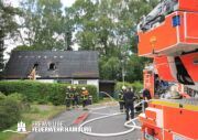 In der Straße Grootmoortwiete brannte der Dachstuhl eines Einfamilienhauses. Bei Ankunft der ersten Einsatzkräfte wurde eine starke Rauchentwicklung im Dachbereich festgestellt und sofort ein C-Rohr im Innenangriff vorbereitet. Ein weiterer Trupp übernahm mit einem B-Rohr eine Riegelstellung für die Nachbargebäude. Im Verlauf ging ein zweiter Trupp mit einem weiteren C-Rohr ebenfalls zur Brandbekämpfung ins Dach vor.