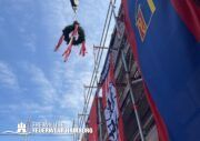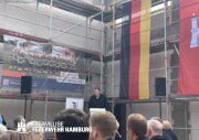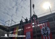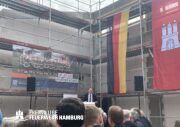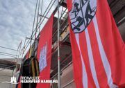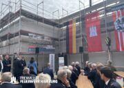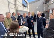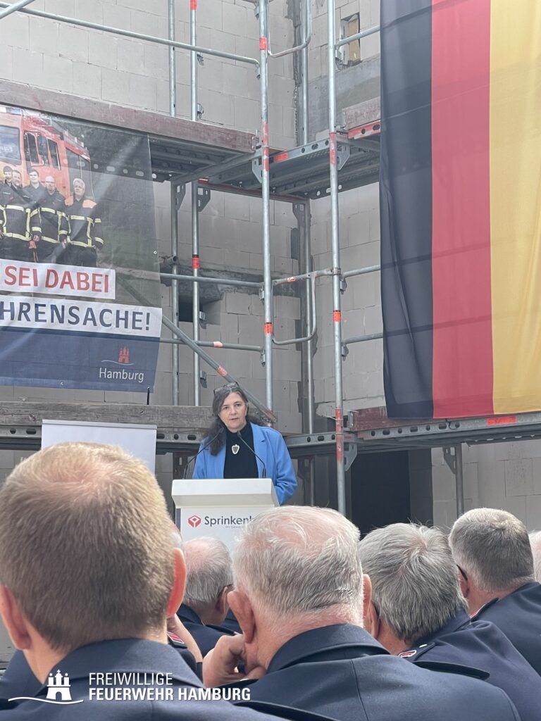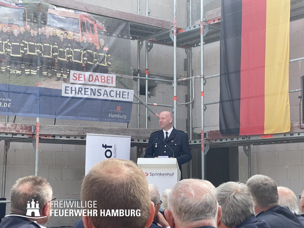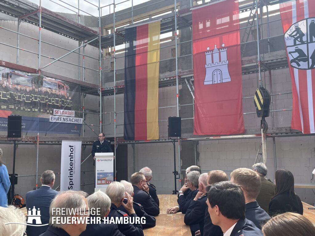 Eine rundum gelungene Veranstaltung: Nach Redebeiträgen von Innensenator Andy Grote, Finanzsenator Dr. Andreas Dressel, Oberbranddirektor Dr. Christian Schwarz, Landesbereichsführer Harald Burghart, Bezirksamtsleiterin Bergedorf Cornelia Schmidt-Hoffmann, Abgeordnetem der Hamburgischen Bürgerschaft Sören Schumacher, dem zweiten Geschäftsführer der Sprinkenhof GmbH Jan Zunke und Wehrführer Niels-Peter Posewang und Kay Hastedt wurde der Richtkranz samt Glück bringendem Richtspruch vom Zimmermann symbolisch in die Höhe gezogen.