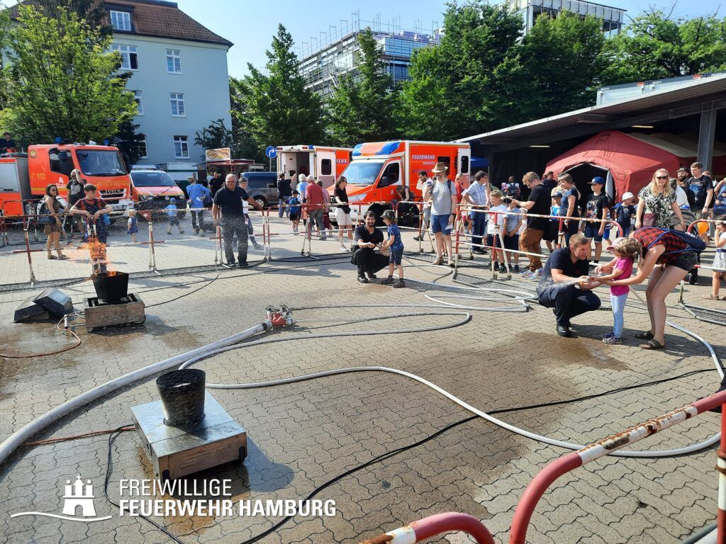 Damit die Kids sich etwas auspowern konnten, gab es die Möglichkeit durch die Mobile Atemschutzübungstrecke zu klettern oder in Zusammenarbeit mit den Höhenrettern Getränkekisten zu stapeln. Die Freiwillige Feuerwehr Alsterdorf stellte ihr HLF aus und sorgte für Spaß am Strahlrohr bei ihren Wasserspielen der Jugendfeuerwehr. Bei der JF Fuhlsbüttel gab es eine alte Löschkutsche zu besichtigen. Auf der Aktionsfläche zeigte die JF Langenhorn ihr können bei einer Übung. Die FF Eppendorf, FF Langenhorn, FF Groß Borstel und FF Langenhorn Nord sorgten bei den Kids ebenfalls für eine Menge Spaß; sie stellten ihre Löschfahrzeuge für Rundfahrten mit Blaulicht auf dem Gelände zur Verfügung. Auch der Bereichsführer Nord, Sven Kohlrusch war vor Ort und unterstützte bei der Organisation.