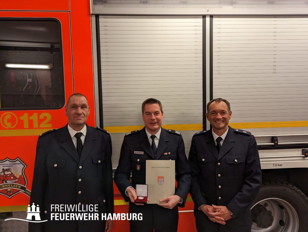 Als besondere Würdigung wurde der Kamerad Marco Niederkleine mit der “Feuerwehr–Verdienstmedaille der 2. Stufe” im Namen des Präses der Behörde für Inneres und Sport, Senator Andy Grote, für sein ehrenamtliches Engagement und seine verdienstvolle Tätigkeit ausgezeichnet.