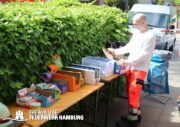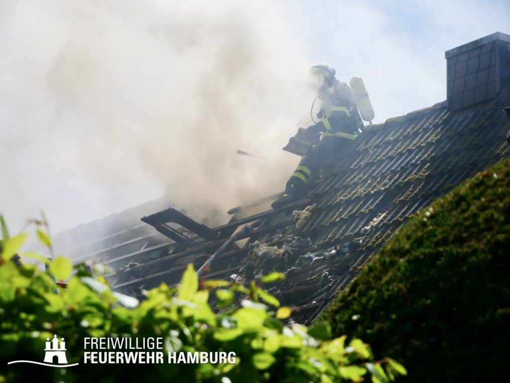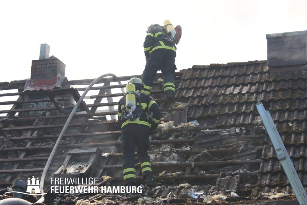Die FF Sasel führte mit den Kräften der Berufsfeuerwehr Sasel einen umfassenden Löschangriff durch und stellte mehrere Trupps unter Atemschutz. Zusätzlich bauten sie eine Wasserversorgung auf und nahmen Teile des Daches über eine Steckleiter auf. Die FF Volksdorf unterstützte ebenfalls mit Atemschutzgeräteträgern bei der Brandbekämpfung und den Nachlöscharbeiten. Aufgrund der Anstrengung der Einsatzkräfte bei Sonne entschied sich der Bereichsführer Sven Kasch schnell dazu, die Verorgungs-Einheit der FF Ottensen-Bahrenfeld mit Kaltgetränken und Snacks anzufordern. Weiterhin koordinierte Sven Kasch die Kräfte der Freiwilligen Feuerwehr vor Ort.