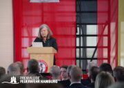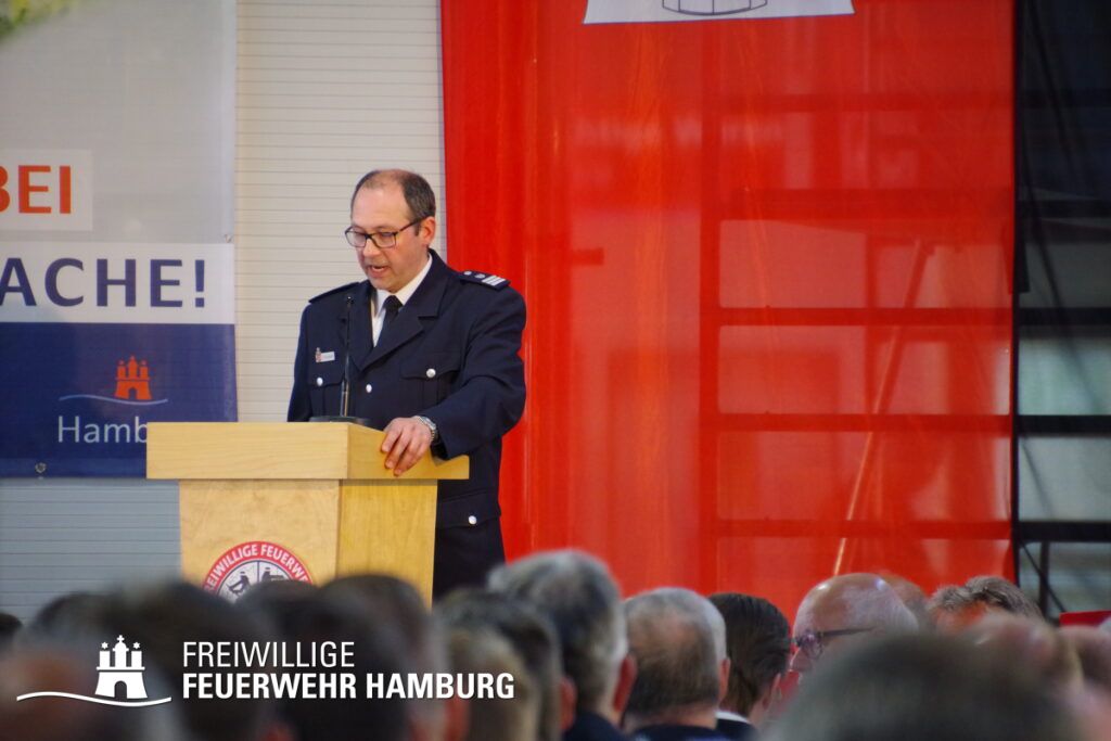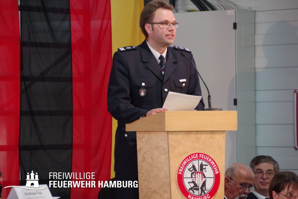 „Ich danke allen Beteiligten für das erfolgreiche Jahr 2022. Insbesondere möchte ich euch, liebe Kameradinnen und Kameraden danken. Ihr bringt euch für unsere Gesellschaft ein, wie es nicht selbstverständlich ist. Denn trotz all der positiven Entwicklungen: Ihr wurdet in 2022 im Einsatz mit rund 13.000 Alarmierungen auch besonders gefordert, denken wir dabei etwa an die Stürme im Februar und an die daraus resultierenden Binnenhochwasser. Ihr opfert eure Freizeit oder euren wertvollen Schlaf, um für unsere Freie und Hansestadt Hamburg auszurücken. Als wäre das noch nicht genug, bringen sich viele von euch nicht nur im Einsatzdienst selbst, sondern auch darüber hinaus mit diversen weiteren Funktionen innerhalb der Freiwilligen Feuerwehr ein, sei es in der Bereichsausbildung, in Arbeitsgruppen oder Stäben. Ihr seid eine tragende Säule unserer Freiwilligen Feuerwehr und damit unserer Gesellschaft – im Einsatzdienst und darüber hinaus. Jede und jeder einzelne von euch hält die Freiwillige Feuerwehr am Laufen. Dafür danke ich euch zutiefst.“
