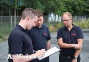 Vom 27. bis 29.06.2023 befanden sich 4 Kameraden vom Stab FF03 Technik (Alexander Wronski, Tobias Hussock, Sven Gerdau, Adrian Pajonk) je ein Maschinist der FF Kraul, FF Neudorf und FF Spadenland sowie 2 Kollegen der Abteilung Technik & Logistik der Berufsfeuerwehr auf den Weg nach Dissen zur Firma Schlingmann um 3 neue HLF20 abzuholen. Seitens der Technik und Logistikabteilung begleiteten Benjamin Bahr (F032 Technische Beschaffung) und Marcel Ullrich (Referat F033 Technische Dienste) die Abholung der Fahrzeuge. Am frühen Dienstagmorgen ging es für 2 Kameraden des Stabes sowie die beiden Kollegen vom Technikzentrum los in Richtung Dissen (Niedersachsen). Nach etwa 3 Stunden Fahrt und einer kurzen Pause wurde das Team im Hause Schlingmann empfangen und es ging gleich in die Übergabehalle, wo 3 HLF20 fast fertig auf die Auslieferung warteten. Bei solch einer Beschaffung gibt es eine Abnahme und Übergabe der Fahrzeuge. Nach ein paar kurzen Gesprächen wurde mit der Abnahme der Fahrzeuge begonnen. Hier wurden sämtliche Bauteile auf Funktion getestet und genauestens begutachtet, um die Fahrzeuge fehlerfrei zu übernehmen. Hier wurde z. B. in einer Gruppe unter dem Fahrzeug geschaut, ob der Korrosionsschutz überall aufgetragen wurde. Gerätefächer wurden leergeräumt, um festzustellen, ob die Kisten mit Beladung sauber in den Schienen laufen oder haken. Bei der Beklebung wurde geschaut, dass diese ordentlich angebracht wurde. Dann wurden die Fahrzeuge auf große Keile gefahren, um zu schauen, ob die Gerätefächer und Türen bei Verwindung des Fahrgestells noch einwandfrei funktionieren. Für den Test der Pumpe hält die Firma Schlingmann einen Pumpenprüfstand vor, an dem Saug- und Tankbetrieb ausgiebig geprüft werden können. Um die Technik des Fahrzeuges beim Fahren zu testen, wurden alle 3 Fahrzeuge in ein Gewerbegebiet gefahren. Hier wurde das Pump and Roll System ausprobiert sowie die Sondersignale. Nach dieser Abnahme wurden kleine Restarbeiten notiert und mit einem Mitarbeiter der Firma Schlingmann besprochen.