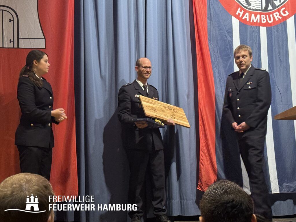 Doch nicht nur Worte wurden an diesem besonderen Tag ausgesprochen, sondern auch Geschenke überreicht. Der Bereich Wandsbek ehrte Sebastian mit einem besonderen Präsent als Dank für seine langjährige Treue und seinen Einsatz. Auch die Wehrführung seiner Heimatwehr Rahlstedt ließ es sich nicht nehmen, Bierdel gebührend zu ehren und seine Verdienste zu würdigen.