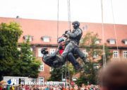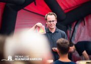 Unter anderem stellten die Polizei- und Feuerwehrtaucher, die Wasserschutzpolizei und auch die Hubschrauberstaffel der Polizei sowie Höhenretter der Feuerwehr eindrucksvoll ihre Tätigkeiten und Aufgabenbereiche vor. Auch unserer Wehren konnten sich präsentieren, so wurden Wasserspiele und Rundfahrten angeboten und Fahrzeuge ausgestellt. Verschiedenste Vorstellungen wurden den Gästen ebenfalls vorgeführt. So könnte die JF Langenhorn eine Einsatzübung präsentieren. Auch der Verkehrskasper, die Motorrad-, Reiter- und Diensthundestaffel der Polizei sorgten ebenso für Spaß und Spannung. Auch der Polizeihubschrauber „Libelle“ könnte von innen und außen bestaunt werden. Außerdem konnten ein Fahrradparcours, eine Schminkstation und weitere Stationen, die Kinderherzen höher schlagen lassen. In der Mobilen Atemschutz Übungsstrecke war es möglich einen Einblick zu bekommen wie Fit Feuerwehrleute sein müssen. Über das neue Teleskopmastfahrzeug der Technik und Umweltschutzwache konnten die Kids an Seilen gesichert Kisten stapeln. Auch Rettungswagen der neusten Generation konnten bestaunt werden und so konnte den kleinen noch etwas zum Thema Erste Hilfe vermittelt werden.