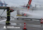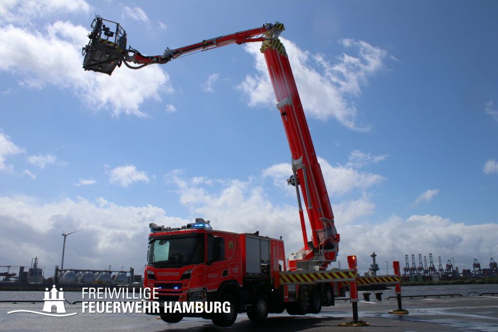 Bei typischem Hamburger Regenwetter, zwischen Sonne und Regen fand heute die offizielle Übergabe des neuen TMF70, des neuen Feuerwehrkrans sowie des Cobra Löschsystems am Cruise Center statt. Im Hintergrund sorgte der Hamburger Hafen mit seinen Containerterminals und der Elbe für das richtige Bild. Im Rahmen eines Pressetermines stellten Innensenator Andy Grote und der stellvertretende Feuerwehrchef Jan Peters das neue Teleskopmastfahrzeug (TMF70), den neuen Feuerwehrkran (FwK) sowie das Cobra Cold Cut Schneidlöschsystem vor. Beide hatten die Möglichkeit mit dem neuen TMF den Hamburger Hafen aus 70 m Höhe zu bestaunen. Natürlich wurde auch die Cobra von beiden getestet und den Medienvertretern vorgeführt. Das Cobra Löschsystem betrifft auch zwei unserer Wehren maßgeblich. Die beiden technischen Wehren FF Warwisch und FF Eppendorf bedienen diese im Einsatzfall und stellen Einsatzkräfte zur Verfügung. Egal ob bei Schiffsbränden in Hamburg, Dachstuhlbränden oder auch LKW Bränden, die Cobra wird bei diesen Einsatzmeldungen mit alarmiert. Auch hier sind unsere Wehren dann im ersten Step mit eingebunden. Gemeinsam mit der Technik und Umweltwache fanden zu diesem Thema auch schon diverse Ausbildungseinheiten sowie Lehrgänge statt, um genug Personal zu schulen.