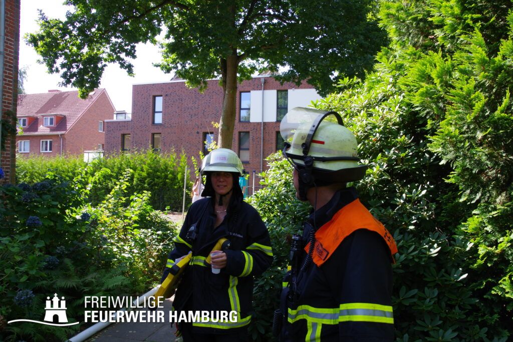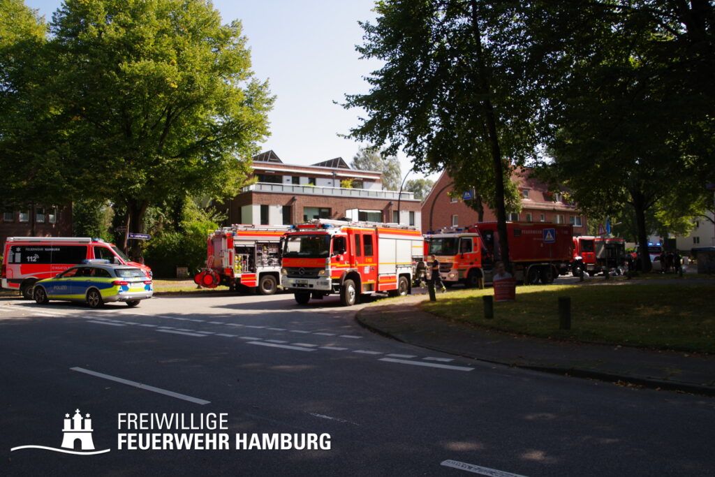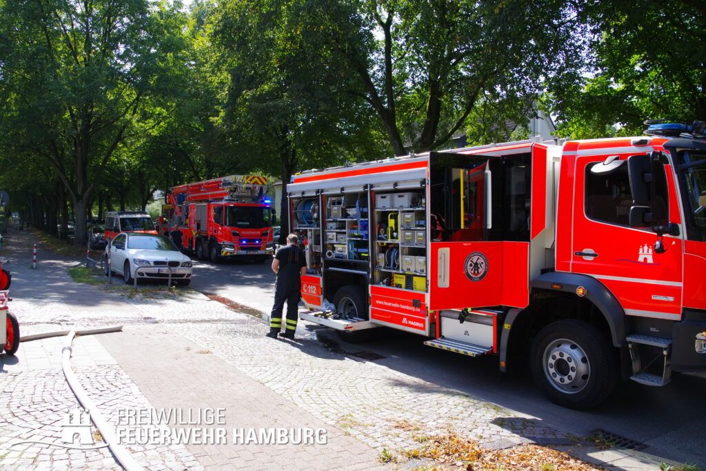 Die Kräfte der FuRW Osdorf und der FF Groß-Flottbek, unterstützt von einem HLF der FuRW Stellingen, nahmen im Erstangriff ein C-Rohr auf die Gaube der Eingangsseite im Außenangriff und 1 C-Rohr über das Treppenhaus in die Wohnung vor. An der Hofseite wurde die Drehleiter der FuRW Osdorf in Stellung gebracht, um ggf. ein weiteres C-Rohr oder einen Wasserwerfer über den Drehleiterkorb zum Einsatz zu bringen, falls das Feuer den Dachstuhl erfassen sollte. Eine Person aus der Brandwohnung wurde vom Rettungsdienst gesichtet, verblieb jedoch an der Einsatzstelle. Aufgrund einer Kräftenachforderung wurde der Einsatz schließlich als Feuer, 2 Löschzüge, mit Rettungsdiensteinsatz – FEU2NOTF – angelegt.