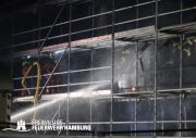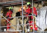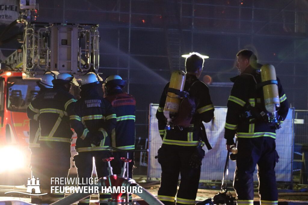 Der Einsatzleiter forderte zur Bewertung der Standsicherheit des Rohbaus einen Baufachberater des Technischen Hilfswerks sowie einen Bagger zur Schaffung von Öffnungen in der Fassade an. Gemeinsam entschied man sich dazu, Teile des Baugerüsts zu entfernen um bessere Zugangsmöglichkeiten zu den Glutnestern von außen zu schaffen. Hierfür kam die Spezialeinsatzgruppe Höhenrettung zum Einsatz. So konnten im Verlauf der Nacht Stück für Stück brennende Gebäudeteile abgelöscht werden. Die Nachlöscharbeiten gestalteten sich jedoch sehr zeitaufwendig, sodass sich diese noch bis zum in den nächsten Tag hinein hinzogen. Dabei konnte das Kräfteaufgebot der Feuerwehr später aber stark reduziert werden. Trotzdem erforderte der Brand jedoch nicht nur in der Anfangsphase, sondern auch im weiteren Verlauf sehr viel Personal und Material. Einsatzkräfte wurden dabei in regelmäßigen Abständen durch andere abgelöst. Nach fast 2 Tagen konnte ‚Feuer aus‘ gemeldet werden. Damit endeten die Maßnahmen der Feuerwehr vor Ort.