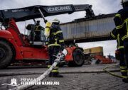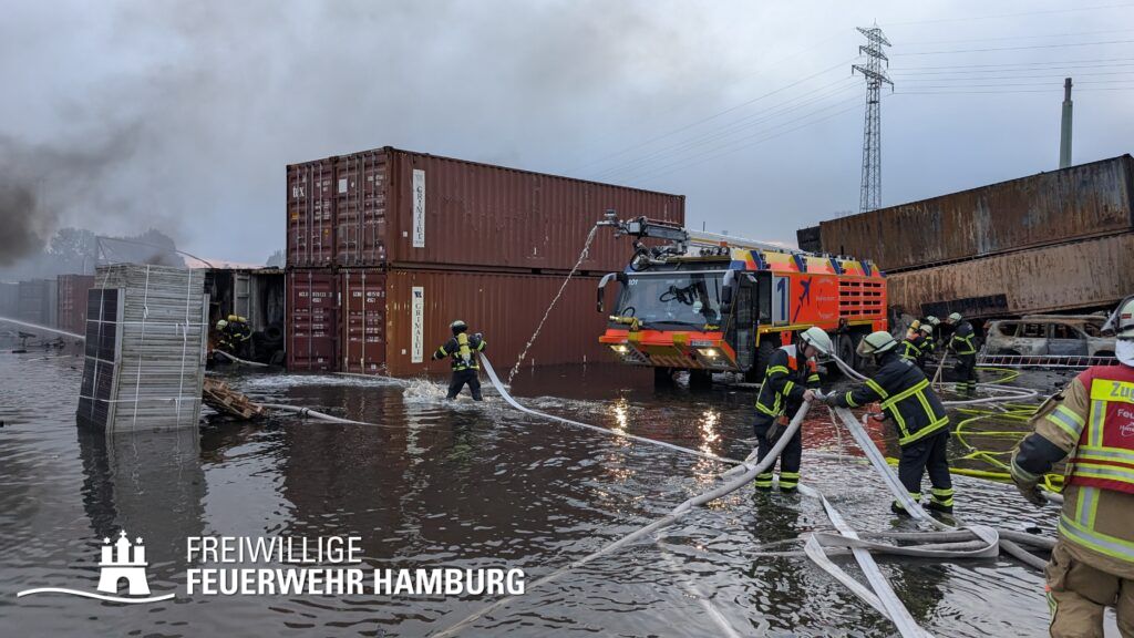Die Drohnen der Feuerwehr und Polizei lieferten wichtige Luftaufnahmen und ermöglichten der Einsatzleitung einen klaren Überblick über die gesamte Einsatzstelle, während die Werkfeuerwehr Aurubis sowie die Flughafenfeuerwehr Hamburg tatkräftig bei der Brandbekämpfung unterstützten. Auch die Polizei spielte eine entscheidende Rolle: Mit gepanzerten Sonderfahrzeugen räumten sie die Straße von Trümmern und halfen mit Wasserwerfern, die Flammen zu bekämpfen. Im späteren Verlauf des Einsatzes konnten durch Löschpanzern der Feuerwehr Vechta bzw. der Firma Alpha Robotics einige Seecontainer gelöscht werden.