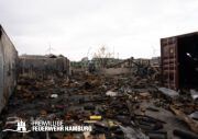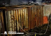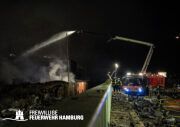 Das Dach der Lagerhalle stürzte bereits vor Mitternacht infolge des Vollbrands ein. Im angrenzenden Containerlager kam es immer wieder zu Explosionen von Druckgasflaschen.