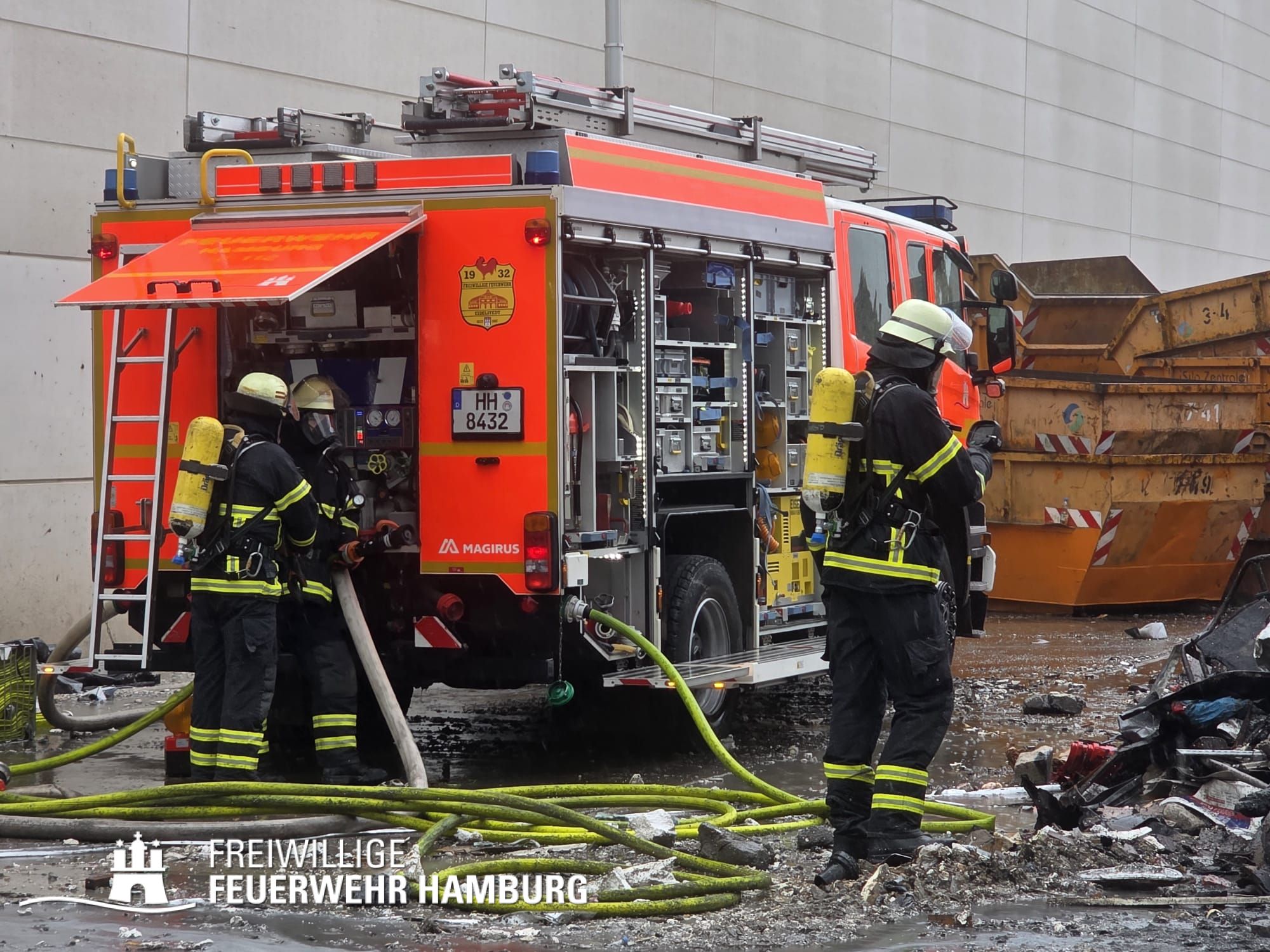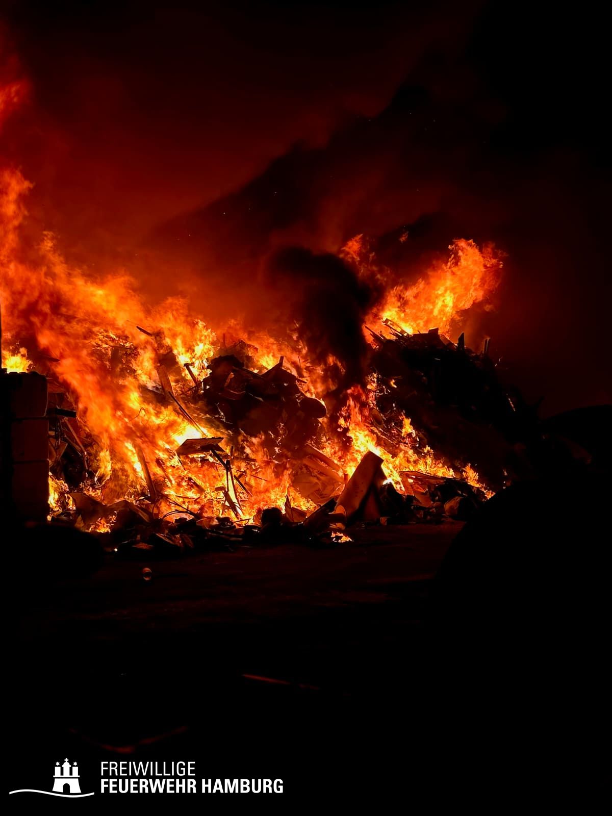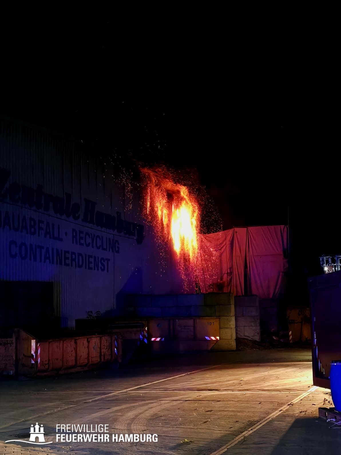 In der Nacht von Freitag auf Samstag wurde über den Notruf 112 der Rettungsleitstelle der Feuerwehr Hamburg ein Brand in einem Recyclingbetrieb gemeldet. Als die ersten Einsatzkräfte der zuständigen Feuer- und Rettungswache Stellingen eintrafen, brannten Bauschutt und Gewerbeabfälle unter einer Schleppdachhalle von ca. 30x20m bereits in voller Ausdehnung. Auch Teile der Halle waren vom Feuer betroffen.