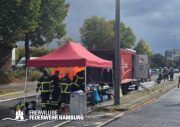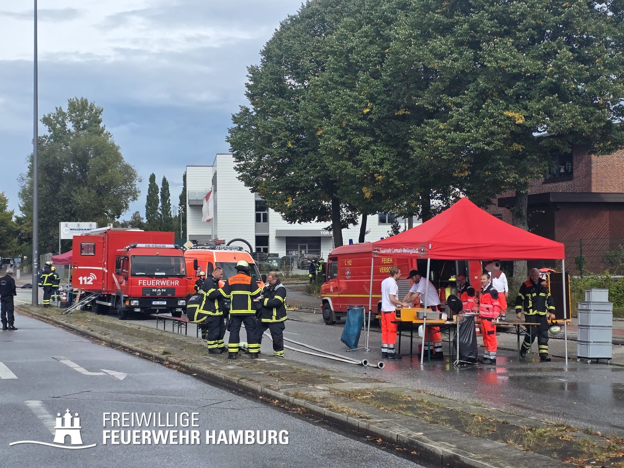 Beim Ablöschen des durch den vom THW aus der Halle beförderten Bauschutt wurden über den Tag die FF Eimsbüttel, Lurup, Osdorf, Berliner Tor, Bergstedt, Fuhlsbüttel und Bille eingesetzt. Für die Versorgung der Kräfte sorgte die FF Eissendorf, welche im späteren Verlauf durch die FF Lemsahl-Mellingstedt abgelöst wurde. Die FF Sinstorf war mit ihrem neuen CBRN-Erkunder zu Messfahrten in der Umgebung im Einsatz.