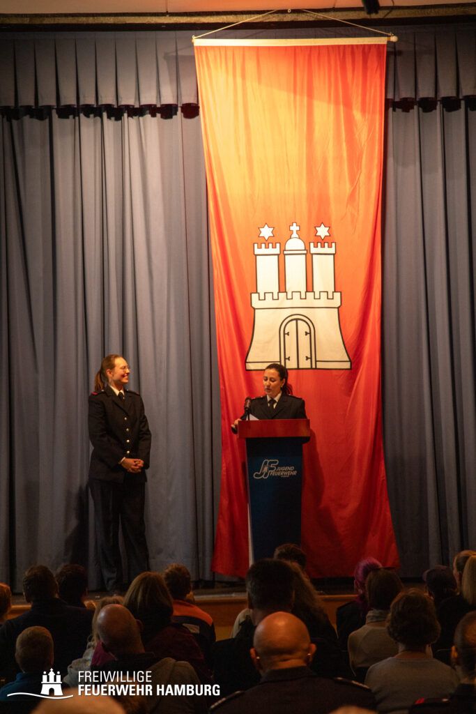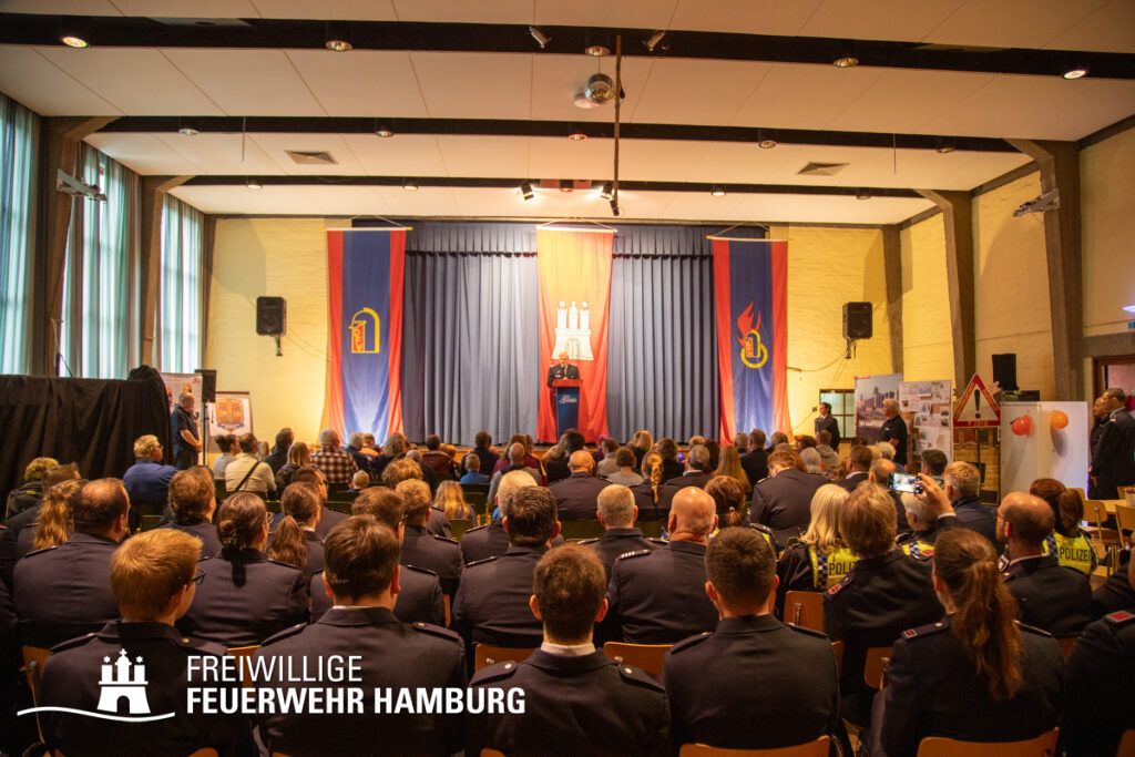 Natürlich kamen auch ein paar Worte aus Feuerwehr, Jugendfeuerwehr und Politik nicht zu kurz – allerdings ganz bewusst in kürzeren Beiträgen gehalten, um dem Fokus der Veranstaltung gerecht zu werden. Es sprachen der Leitende Branddirektor Paul Middendorf für die Feuerwehr Hamburg, Harald Burghart als Landesbereichsführer für die Freiwillige Feuerwehr Hamburg sowie Henrik Strate als stellvertretender Landesjugendfeuerwehrwart. Auch Vertreter*innen der Politik ließen es sich nicht nehmen, der neuen Minifeuerwehr persönlich zu gratulieren.