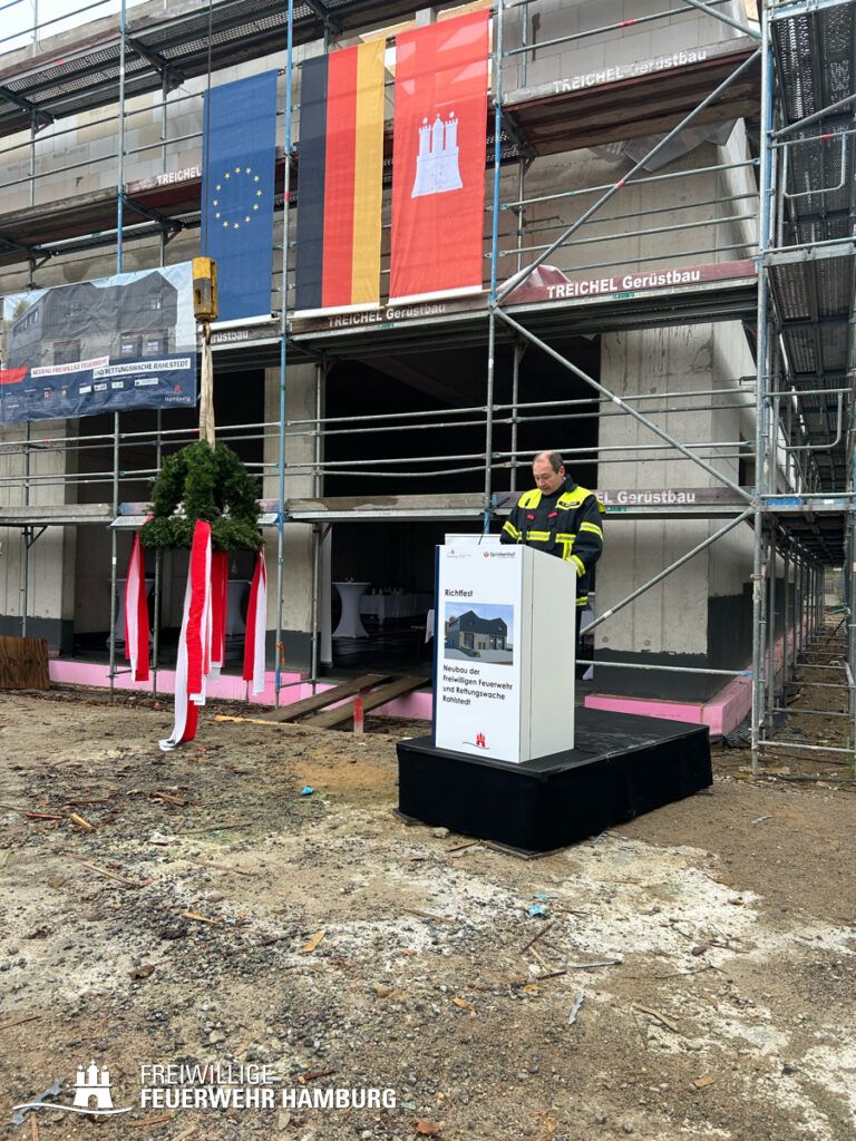 Am Mittwoch wurde im Beisein von Andy Grote, Senator für Inneres und Sport, Jörg Sauermann, dem Leiter der Hamburger Feuerwehr, Harald Burghart, Landesbereichsführer der Freiwilligen Feuerwehr Hamburg, sowie Martin Sowinski, Geschäftsführer der Sprinkenhof GmbH, das Richtfest für den Neubau des Feuerwehrgerätehauses der Freiwilligen Feuerwehr mit integrierter Rettungswache in Rahlstedt gefeiert. Die Fertigstellung des Gebäudes ist für Herbst 2026 geplant, die Baukosten belaufen sich auf rund 8,6 Millionen Euro.