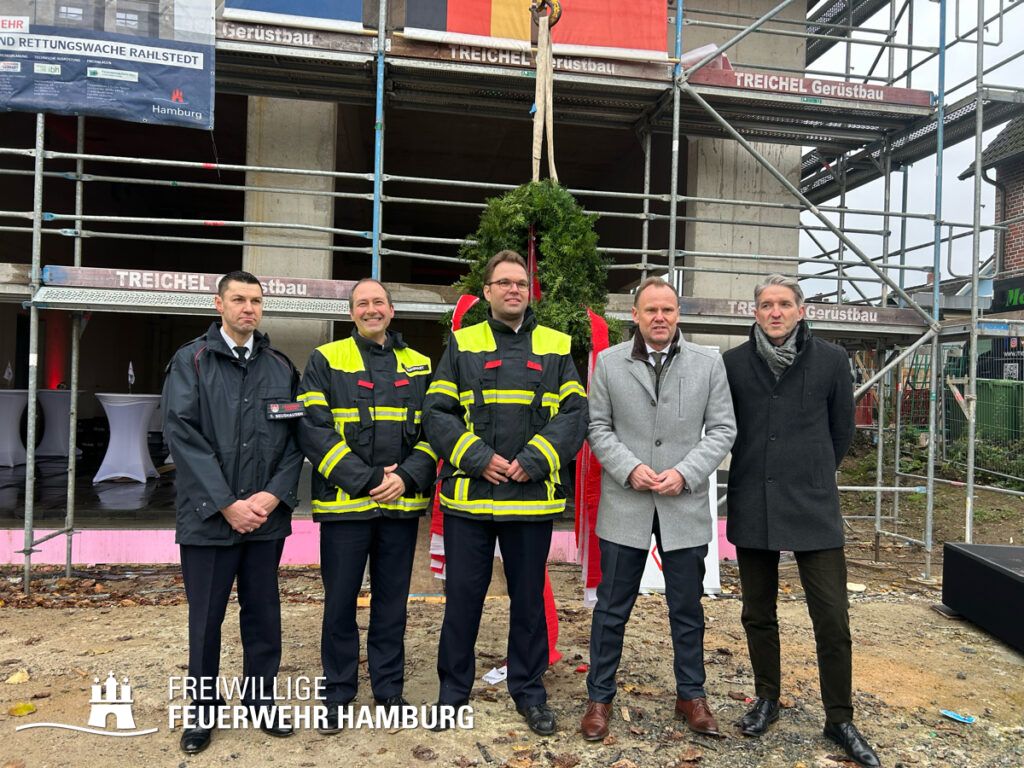 Am Mittwoch wurde im Beisein von Andy Grote, Senator für Inneres und Sport, Jörg Sauermann, dem Leiter der Hamburger Feuerwehr, Harald Burghart, Landesbereichsführer der Freiwilligen Feuerwehr Hamburg, sowie Martin Sowinski, Geschäftsführer der Sprinkenhof GmbH, das Richtfest für den Neubau des Feuerwehrgerätehauses der Freiwilligen Feuerwehr mit integrierter Rettungswache in Rahlstedt gefeiert. Die Fertigstellung des Gebäudes ist für Herbst 2026 geplant, die Baukosten belaufen sich auf rund 8,6 Millionen Euro.