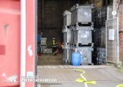 Ein bislang unbekannter Stoff reagierte vermutlich mit einem anderen Stoff und entzündete sich in einer Halle, in der Gefahrgüter gelagert werden. Das Feuer brach in einer Lagerhalle mit den Maßen von ca. 20×80m aus. Daraufhin wurde die Alarmstufe auf „Feuer 2 Löschzüge mit Gefahrstoffen“ erhöht. Aufgrund dieses Alarmstichwortes wurde ein CBRN-Zug der Freiwilligen Feuerwehr mit alarmiert. Der Brand konnte zu Beginn bereits von Mitarbeitern mit CO₂ Löschern bekämpft werden. Das Feuer flammte jedoch immer wieder auf. Daher wurde ein Löschangriff sowie weitere C02 Löscher in Bereitstellung gebracht. Über einen Gabelstapler der Technik und Umweltwache wurde das betroffene Gefahrgut in einer Gefahrgutwanne aus der Halle gefahren und in eine weitere Mulde gestellt und konnte dort kontrolliert abgelöscht werden.