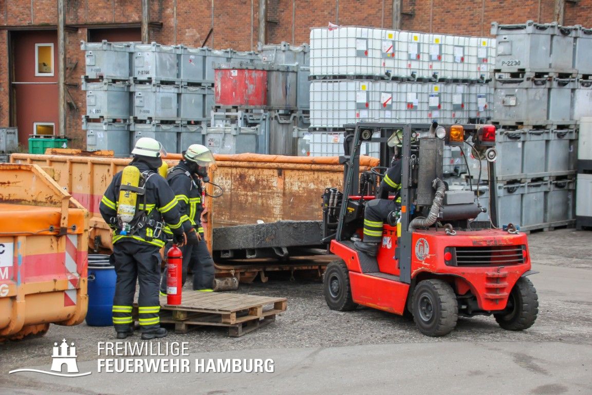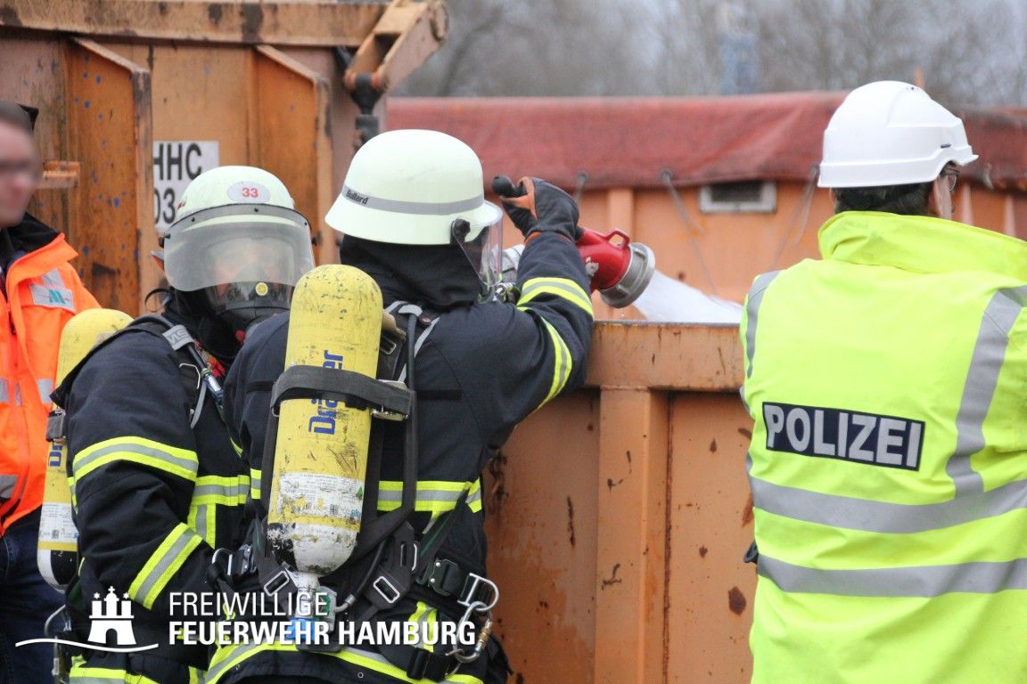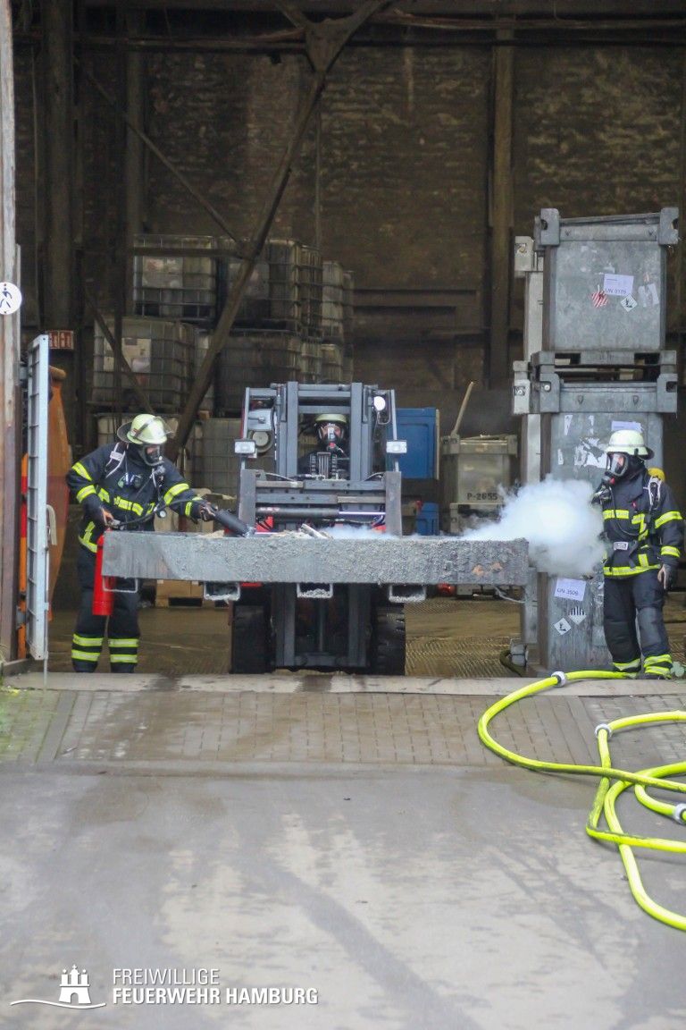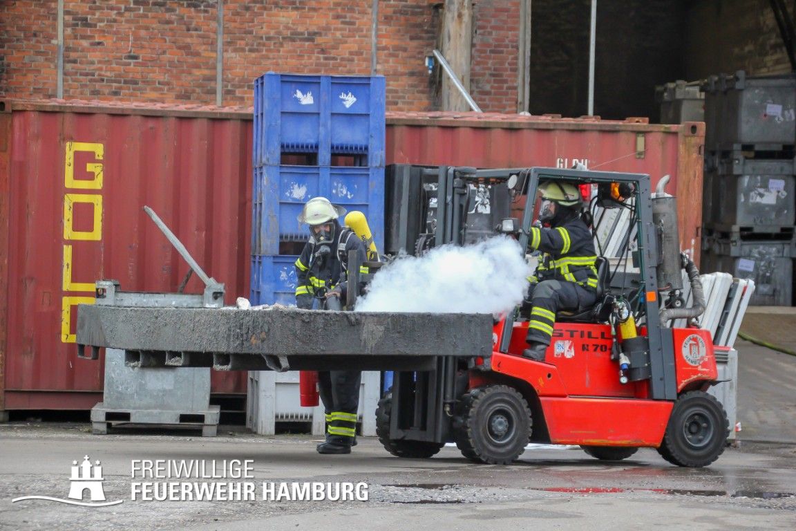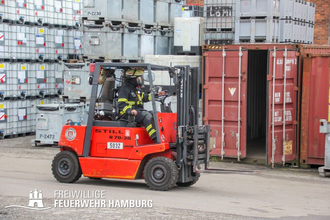 Im weiteren Verlauf wurde der Gefahrgutbehälter durch den Gabelstapler der Feuerwehr unter Atemschutz und ständigen Löschmaßnahmen aus der Halle befördert und in einen Container verbracht, der anschließend mit Wasser geflutet wurde. Die Kräfte des CBRN Zuges der Freiwilligen Feuerwehr waren in Bereitstellung vor Ort. Die FF Rotenburgsort-Veddel und FF Wilhelmsburg unterstützten mit Atemschutzgeräteträgern. Der Bereichsführer Harburg koordinierte vor Ort die Kräfte der Freiwilligen Feuerwehr. Nach ca. 3,5 Stunden war der Einsatz beendet.