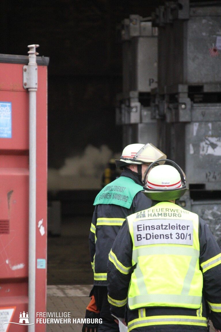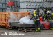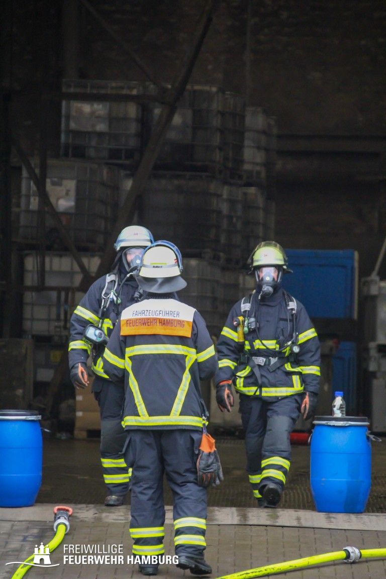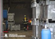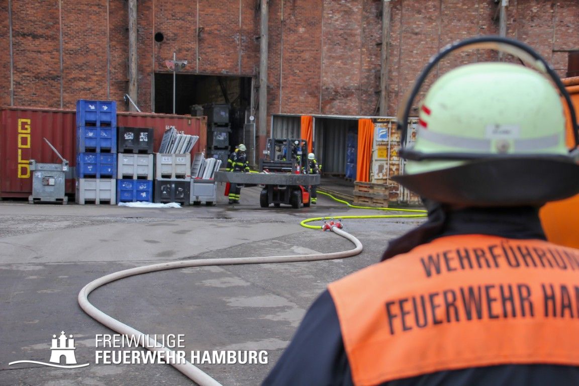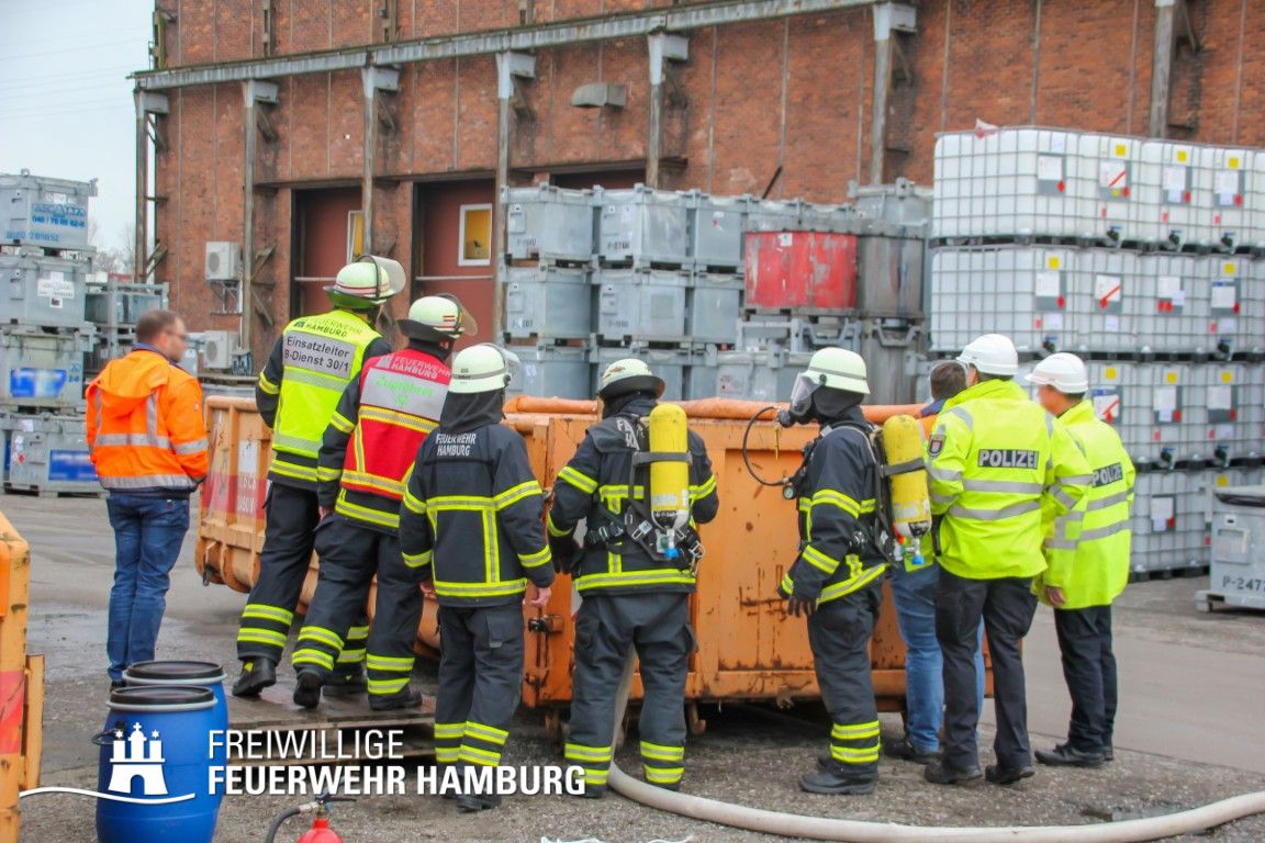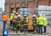Im weiteren Verlauf wurde der Gefahrgutbehälter durch den Gabelstapler der Feuerwehr unter Atemschutz und ständigen Löschmaßnahmen aus der Halle befördert und in einen Container verbracht, der anschließend mit Wasser geflutet wurde. Die Kräfte des CBRN Zuges der Freiwilligen Feuerwehr waren in Bereitstellung vor Ort. Die FF Rotenburgsort-Veddel und FF Wilhelmsburg unterstützten mit Atemschutzgeräteträgern. Der Bereichsführer Harburg koordinierte vor Ort die Kräfte der Freiwilligen Feuerwehr. Nach ca. 3,5 Stunden war der Einsatz beendet.