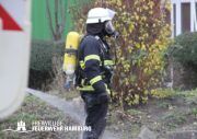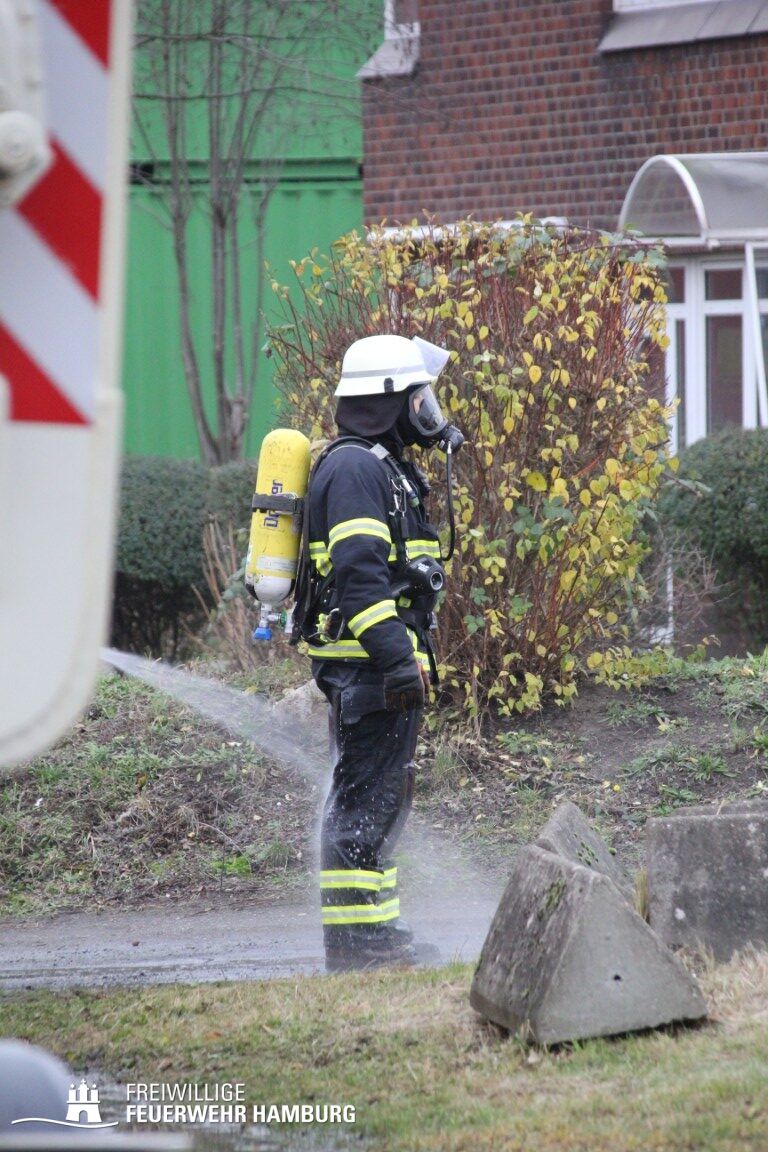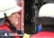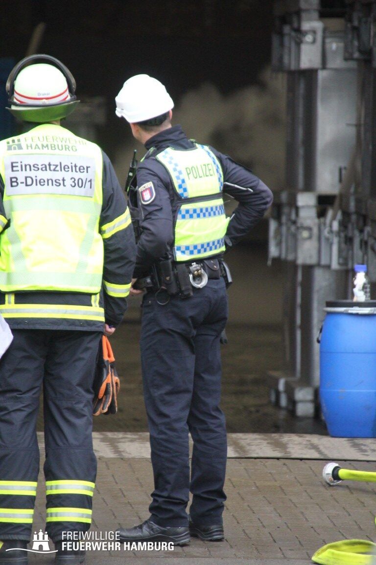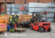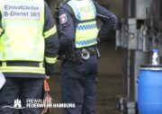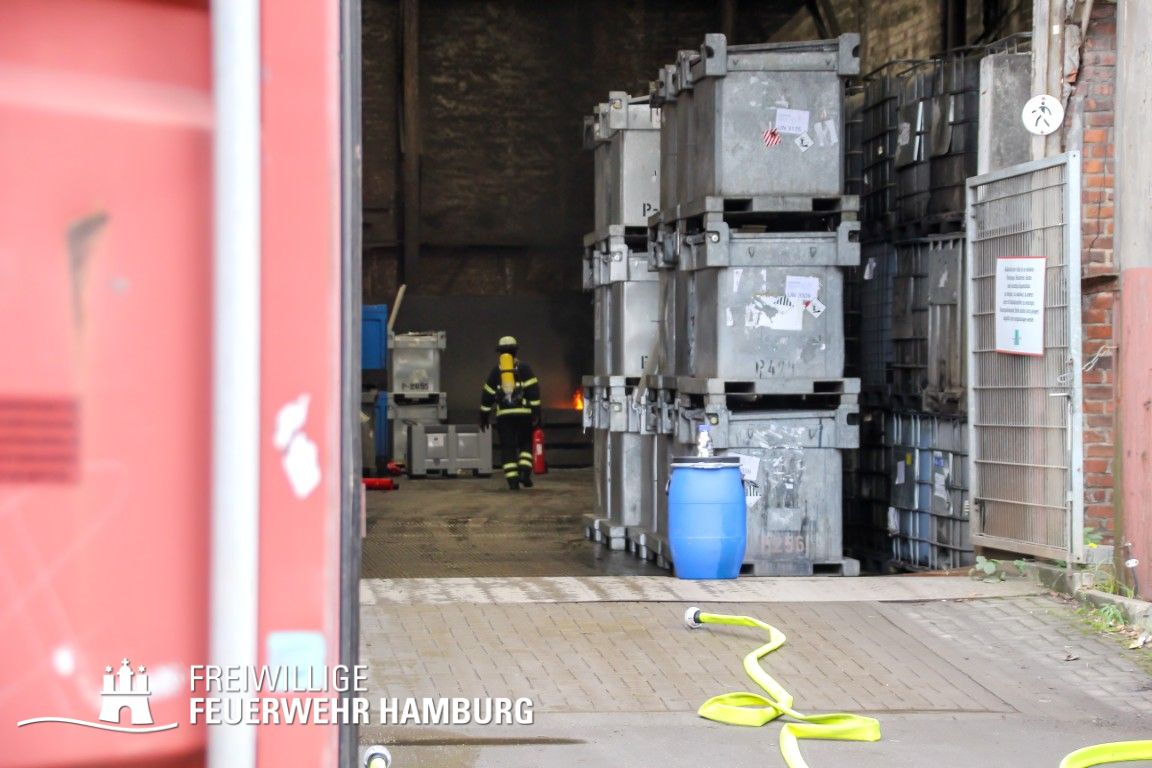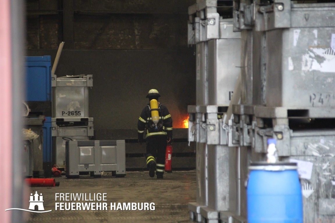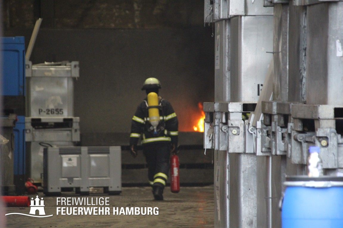 Im weiteren Verlauf wurde der Gefahrgutbehälter durch den Gabelstapler der Feuerwehr unter Atemschutz und ständigen Löschmaßnahmen aus der Halle befördert und in einen Container verbracht, der anschließend mit Wasser geflutet wurde. Die Kräfte des CBRN Zuges der Freiwilligen Feuerwehr waren in Bereitstellung vor Ort. Die FF Rotenburgsort-Veddel und FF Wilhelmsburg unterstützten mit Atemschutzgeräteträgern. Der Bereichsführer Harburg koordinierte vor Ort die Kräfte der Freiwilligen Feuerwehr. Nach ca. 3,5 Stunden war der Einsatz beendet.