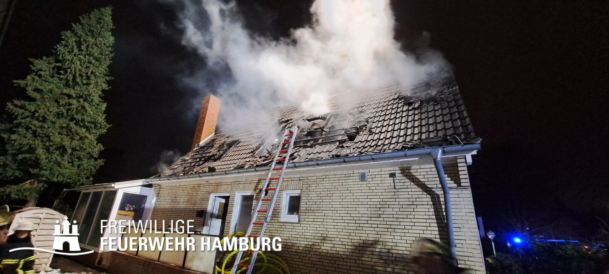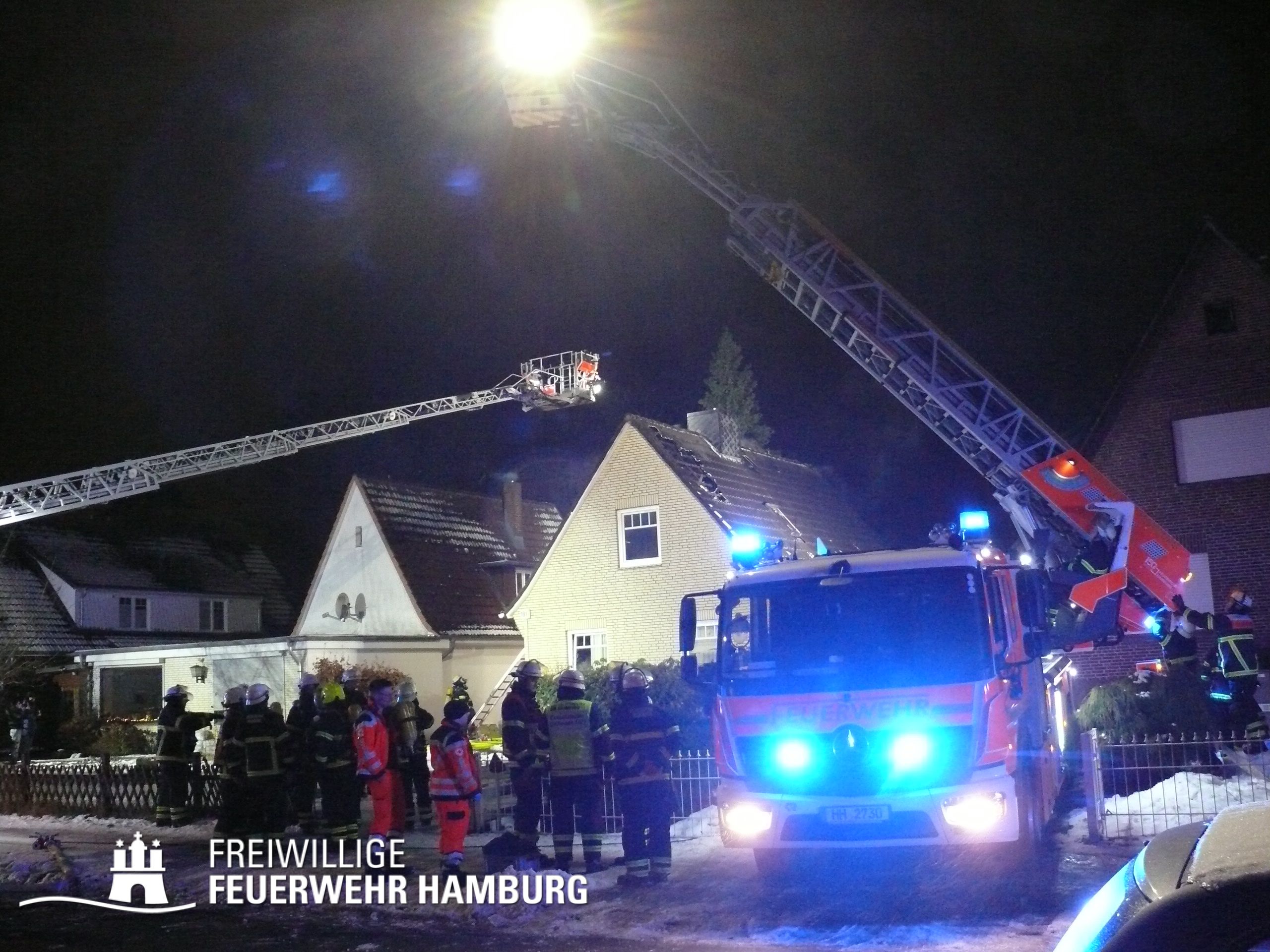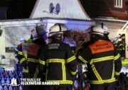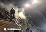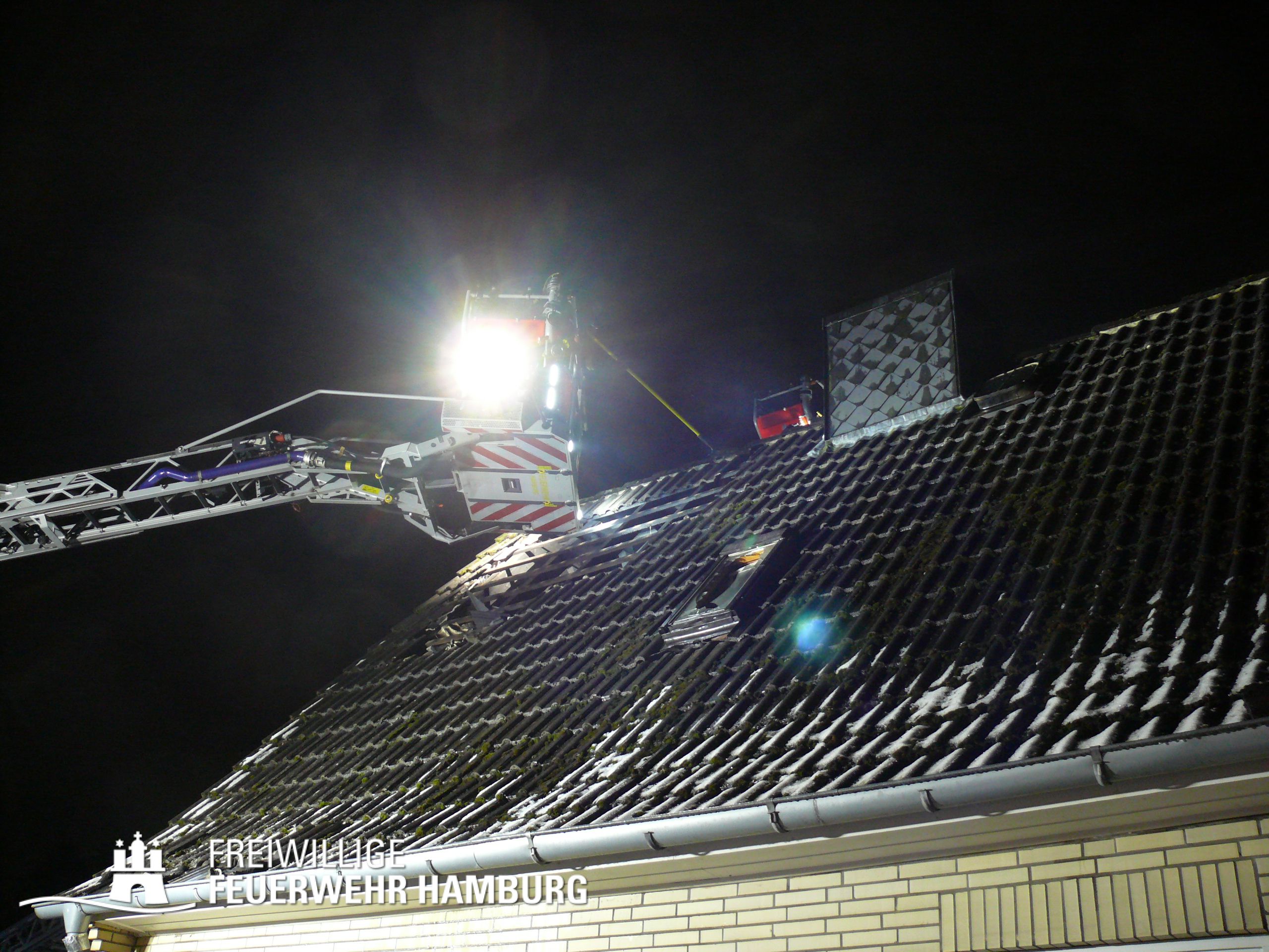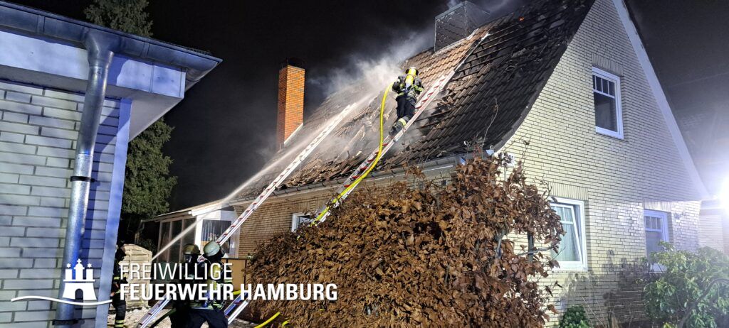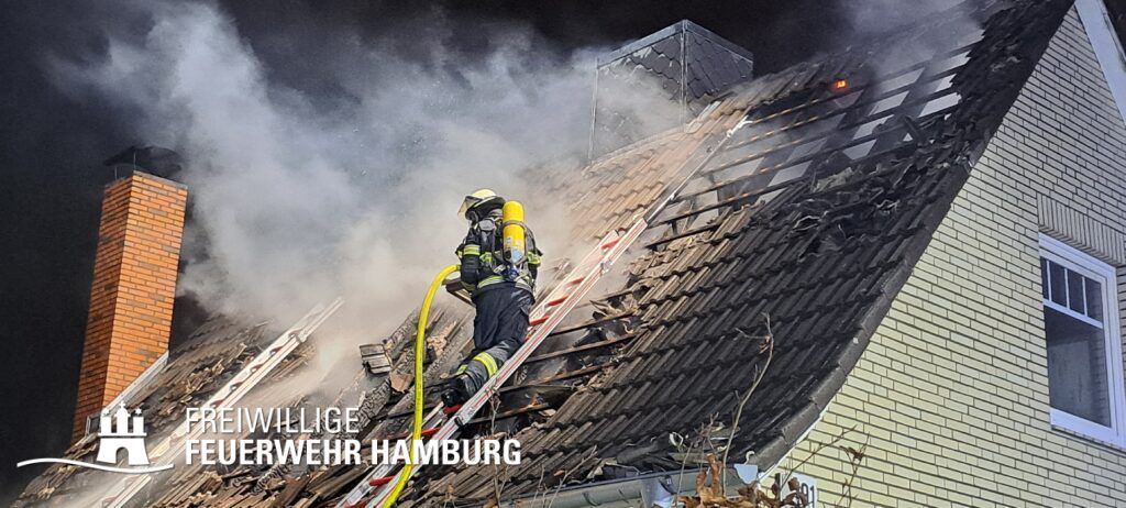 Aus bisher ungeklärter Ursache kam es gegen 18.00h zu einem Dachstuhlbrand in einem älteren Einfamilienhaus auf der gesamten Fläche von ca. 8×10 Metern. Aufgrund der Schilderung der bei der Rettungsleitstelle der Feuerwehr Hamburg Anrufenden wurde die Alarmstufe von FEUY (Feuer mit Menschenleben in Gefahr) auf FEU2Y (Feuer mit Menschenleben in Gefahr, 2 Löschzüge) erhöht.
