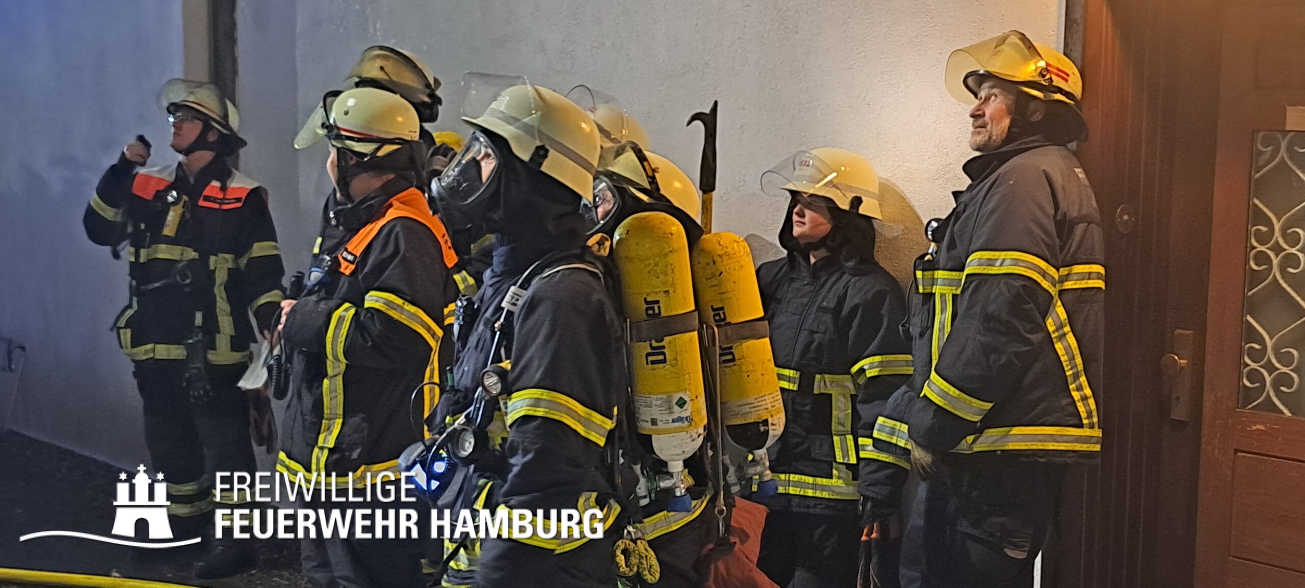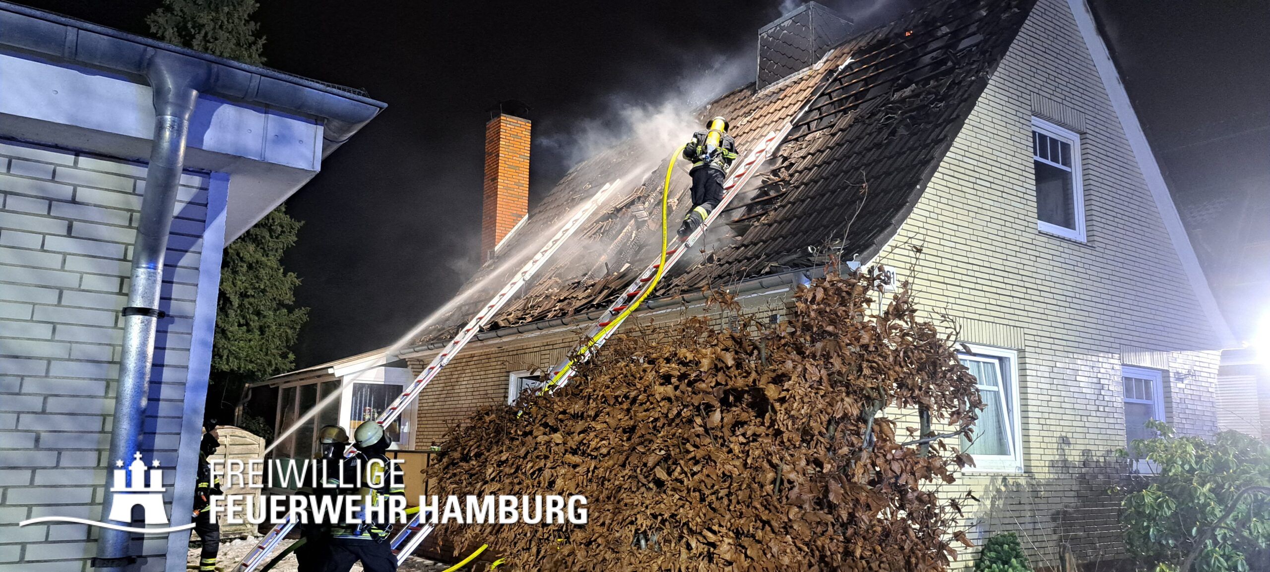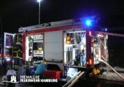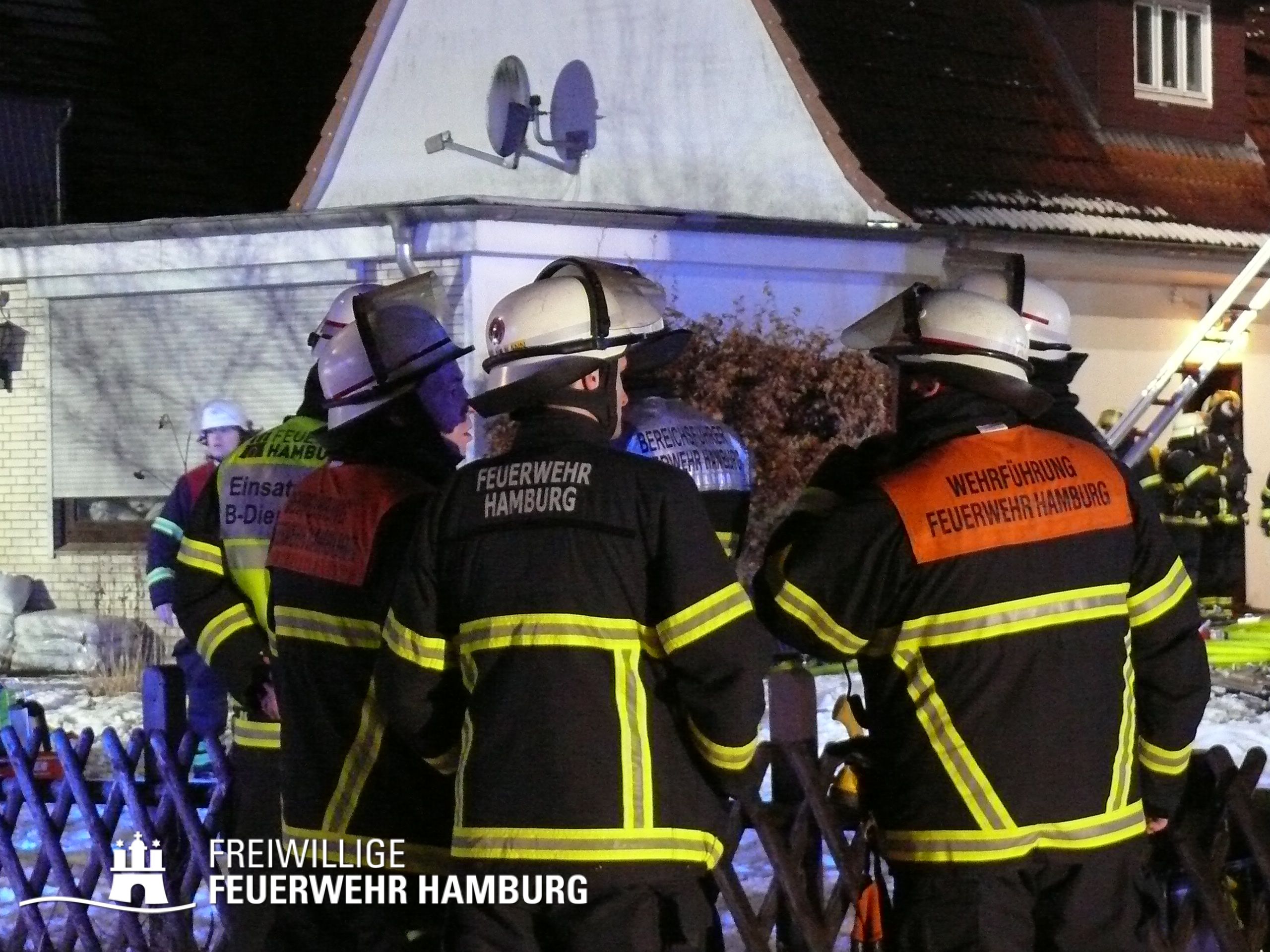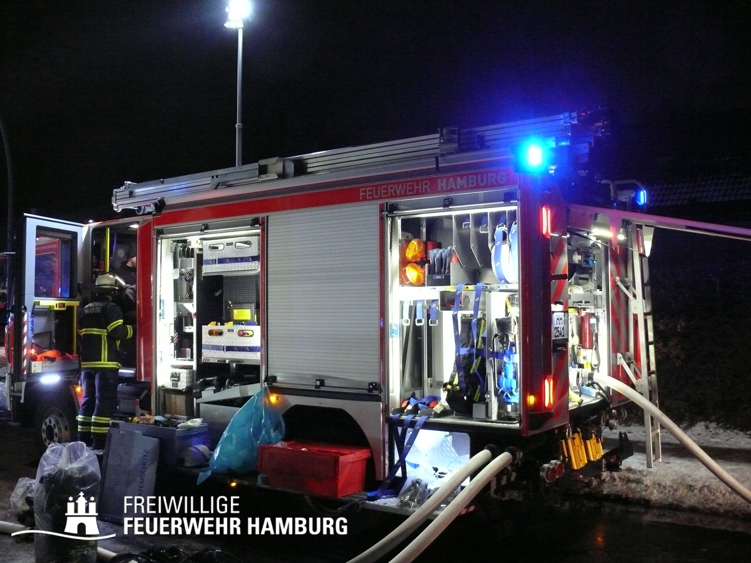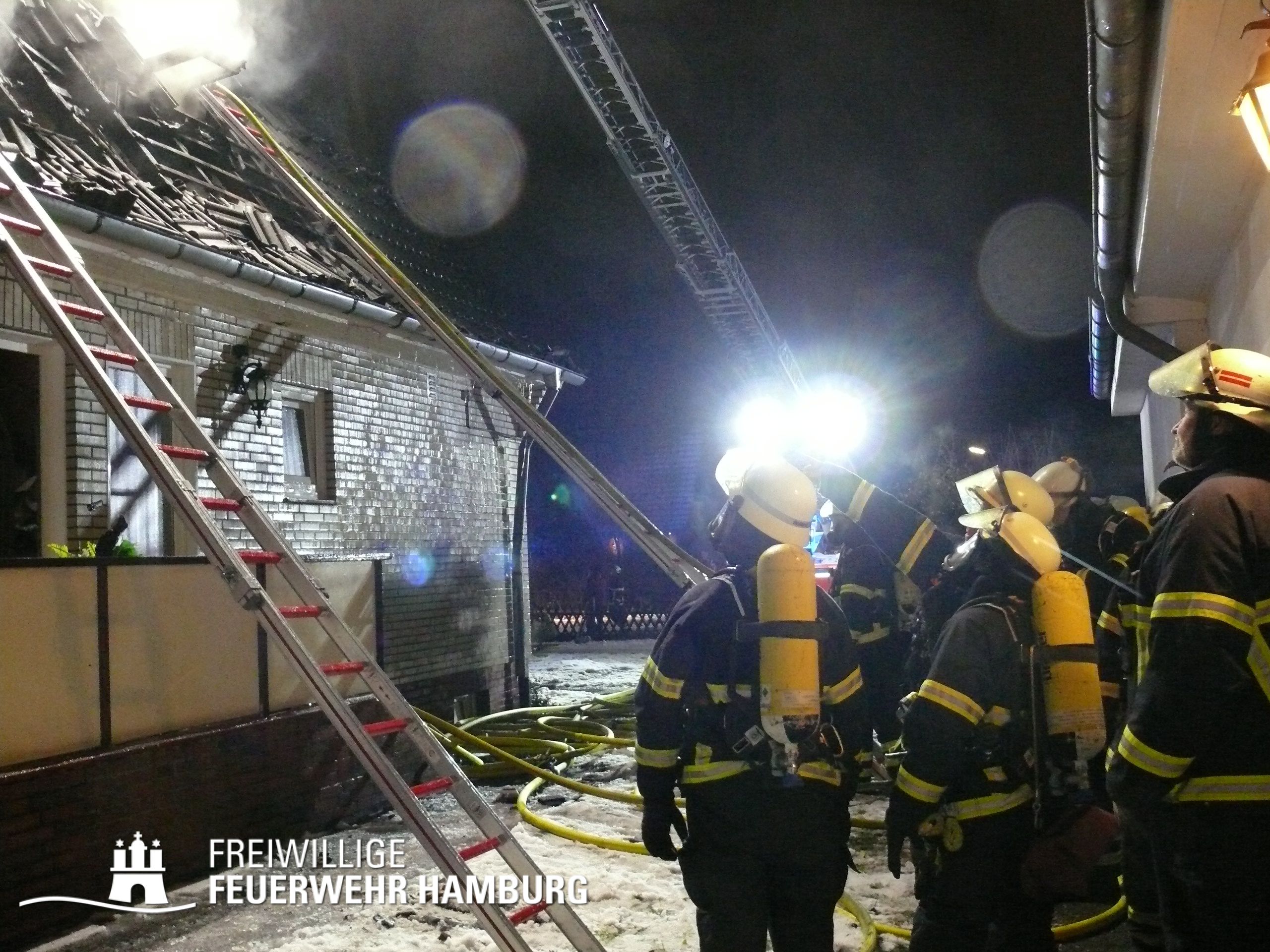 Die mit dem 1. Löschzug, bestehend aus Kräften der Feuer- und Rettungswache Osdorf und einem HLF der Feuer- und Rettungswache Stellingen, eintreffende FF Eidelstedt setzte einen Atemschutz-Trupp ein und unterstützte beim Aufbau der ersten Wasserversorung. Zwischenzeitlich wurde ein Trupp der Berufsfeuerwehr ebenfalls im Innenangriff eingesetzt und die Drehleiter links vom Gebäude in Stellung gebracht, um ggf. vom Korb aus ein weiteres C-Rohr zum Einsatz zu bringen. Glücklicherweise hatten alle Personen zu diesem Zeitpunkt das Gebäude bereits verlassen und ein Hund wurde von den Trupps gerettet. Verletzt wurde niemand, so dass sich die Kräfte auf die Brandbekämpfung konzentrieren konnten.