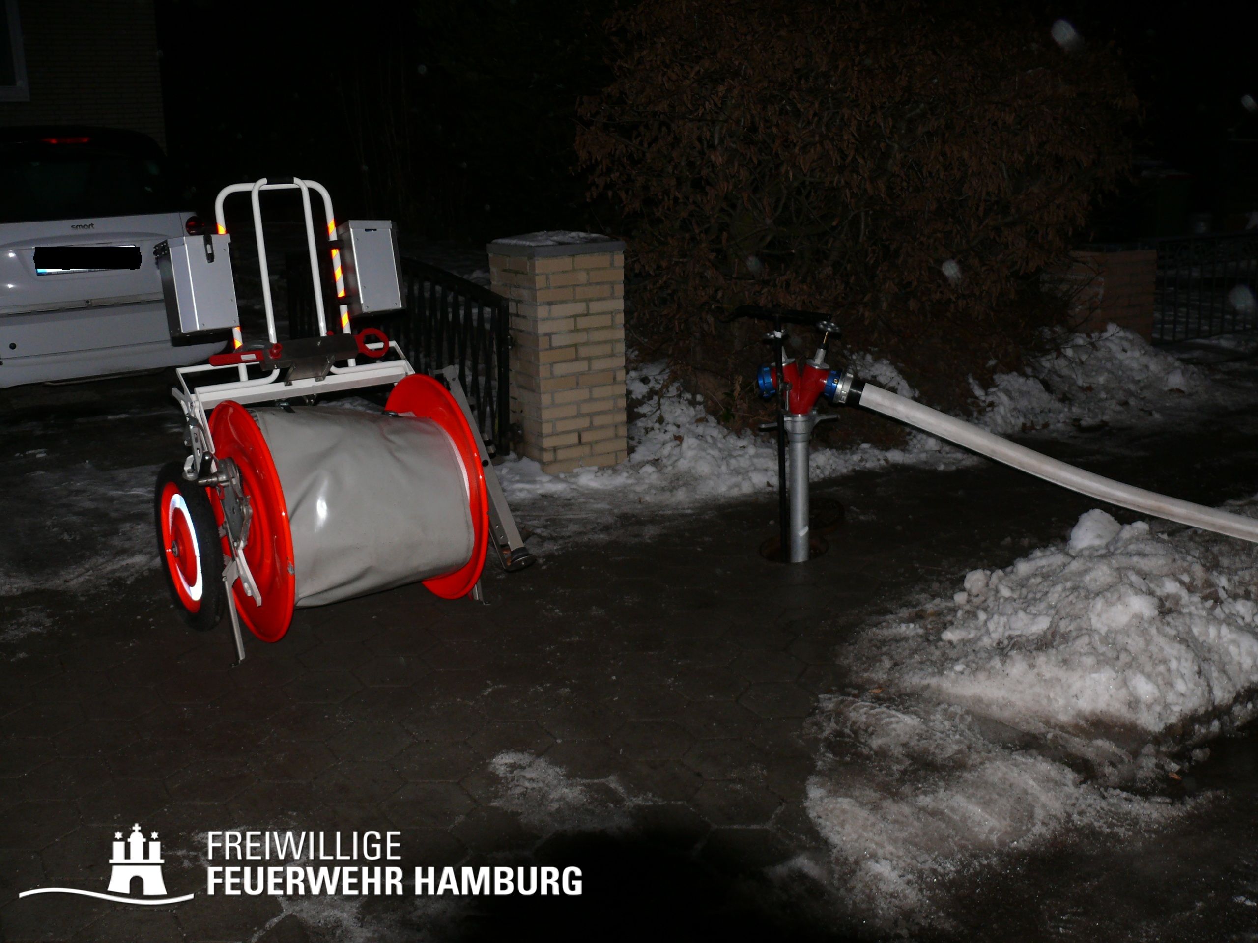 Die winterlichen Verhältnisse mussten ebenfalls berücksichtigt werden. So waren die Hydranten unter Schnee und Eis zum Teil schwierig in Betrieb zu nehmen. Zwischenzeitlich war die FF Osdorf als Verstärkung alarmiert worden, wenig später der 2. Löschzug, bestehend aus dem Rest des Löschzuges der Feuer- und Rettungswache Stellingen und der FF Stellingen. Sie brachten die zweite Drehleiter zum Einsatz und unterstützten sowohl bei den Lösch- als auch den Nachlösch- und Aufräumarbeiten. Es wurden, insbesondere durch die FF, mehrere tragbare Leitern an der linken Gebäudeseite und ein weiteres C-Rohr an der rechten Gebäudeseite vorgenommen.