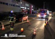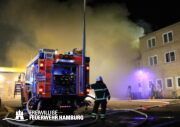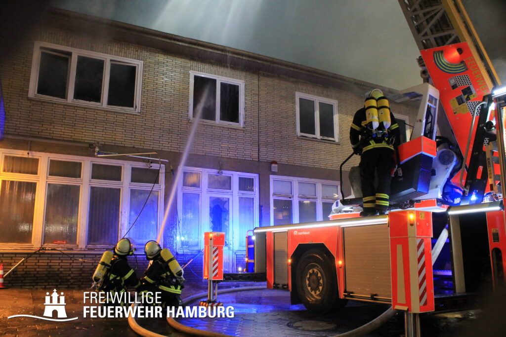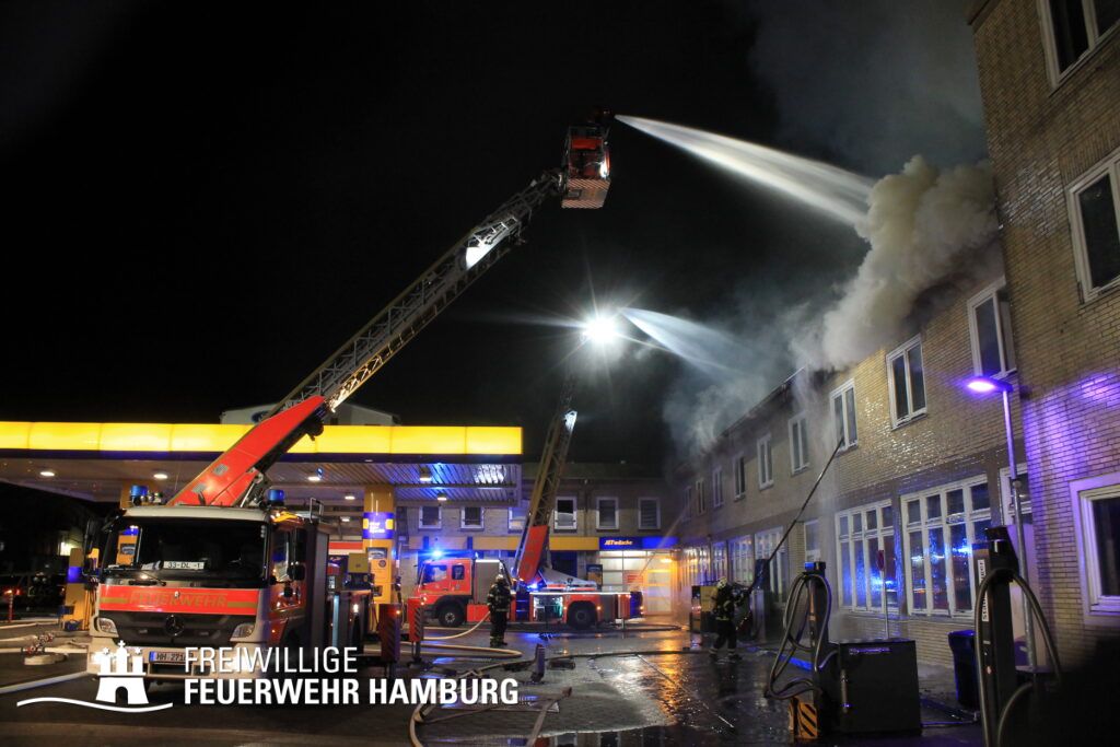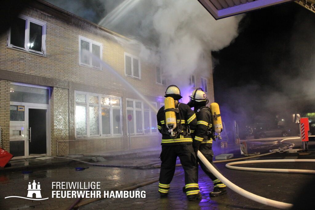 Im 3. Obergeschoss eines leerstehenden Bürokomplexes an der Buxtehuder Straße brach am Freitagabend ein Feuer aus. Das direkt neben einer Tankstelle befindliche Haus ist in U-Form gebaut und besteht aus mehreren großen Fluren sowie größeren Räumen. Schnell fraß sich das Feuer von dem Brandraum in das Dachgeschoss in Flachdachbauweise und breitete sich auf die gesamte Zwischendecke aus. Als die ersten Einsatzkräfte der BF Harburg gemeinsam mit der FF Eißendorf eintrafen, schlugen bereits Flammen aus einigen Fenstern. Schnell erhöhte der Zugführer auf FEU2 (Feuer, 2 Löschzüge). In diesem Verlauf wurde die FF Hausbruch und der Bereichsführer Süderelbe zugeordnet. Schnell wurde ein massiver Löschangriff aufgebaut um ein Ausbreiten auf weitere Gebäudeteile und die Tankstelle zu verhindern, weshalb die Alarmstufe nochmal auf FEU3 (Feuer,3 Löschzüge) erhöht wurde. Durch den aufwendigen Löschangriff über mehrere C und B Rohre musste noch weitere Atemschutzgeräteträger und eine Drehleiter angefordert werden, so dass der Einsatzleiter nochmals die Alarmstufe auf FEU4 (Feuer,4 Löschzüge) erhöhen ließ. Um an die Glutnester im Dach heranzukommen, wurden über Kettensägen Löcher in die Dachhaut geschnitten. Der Einsatz zog sich bis in den frühen Samstagmorgen