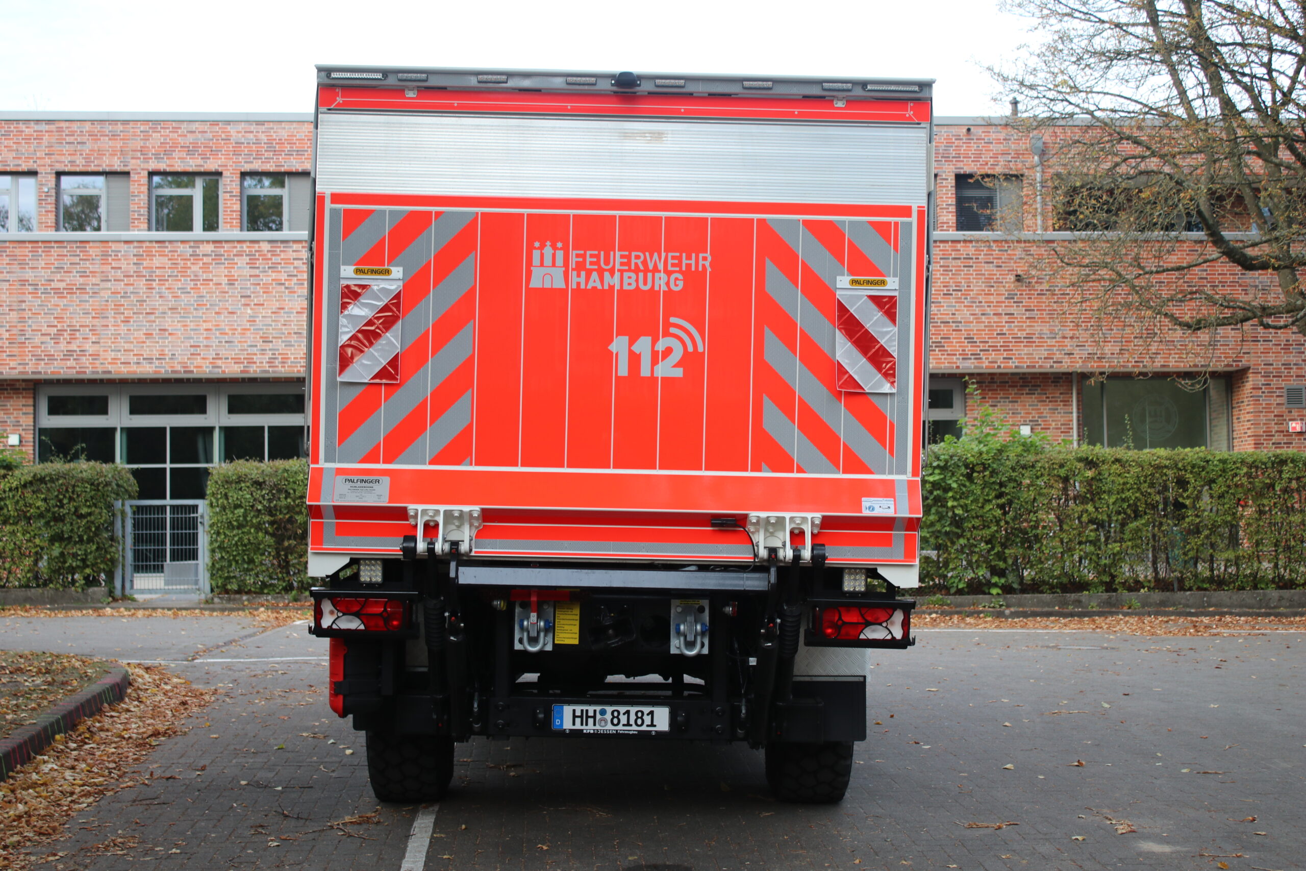 Heckabsicherung mit blauen und gelben LED-Leuchten.