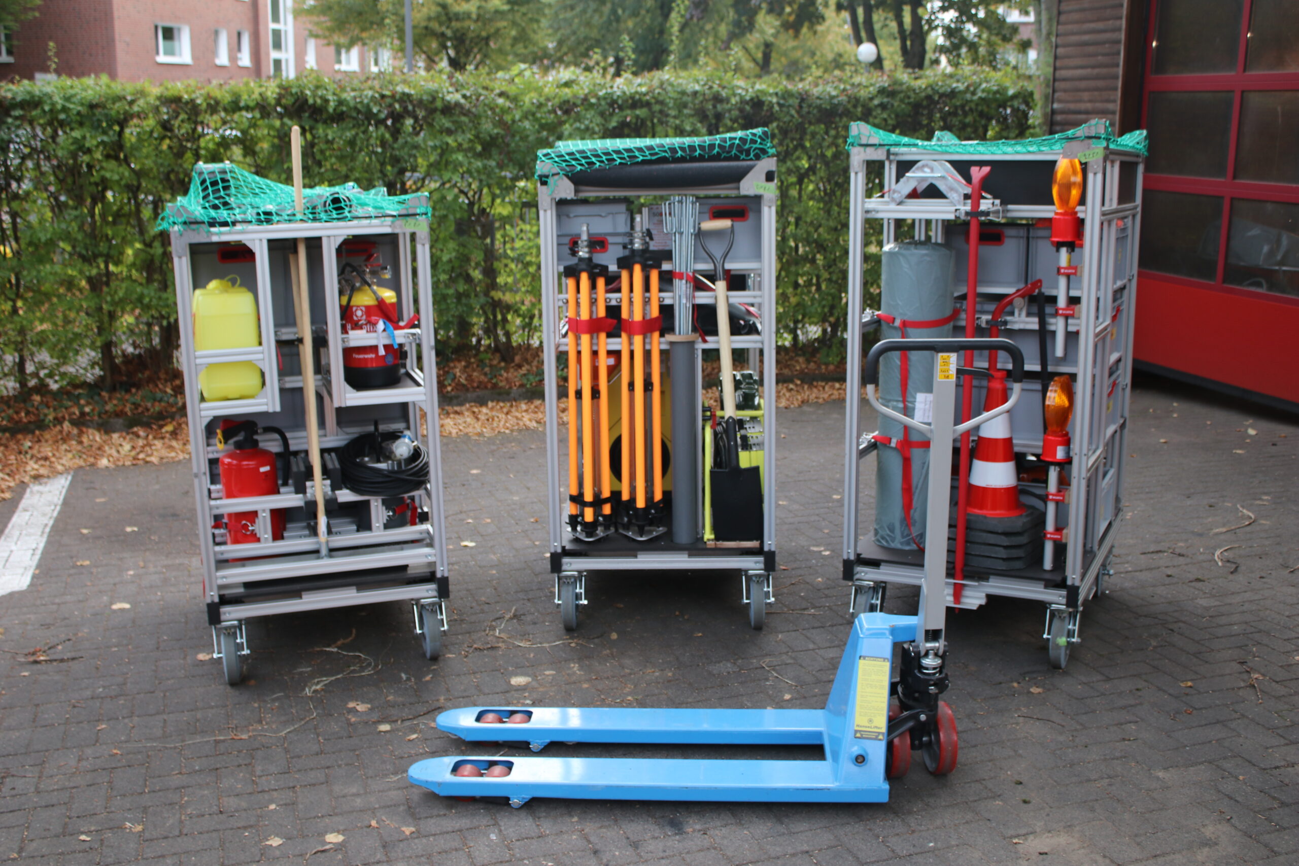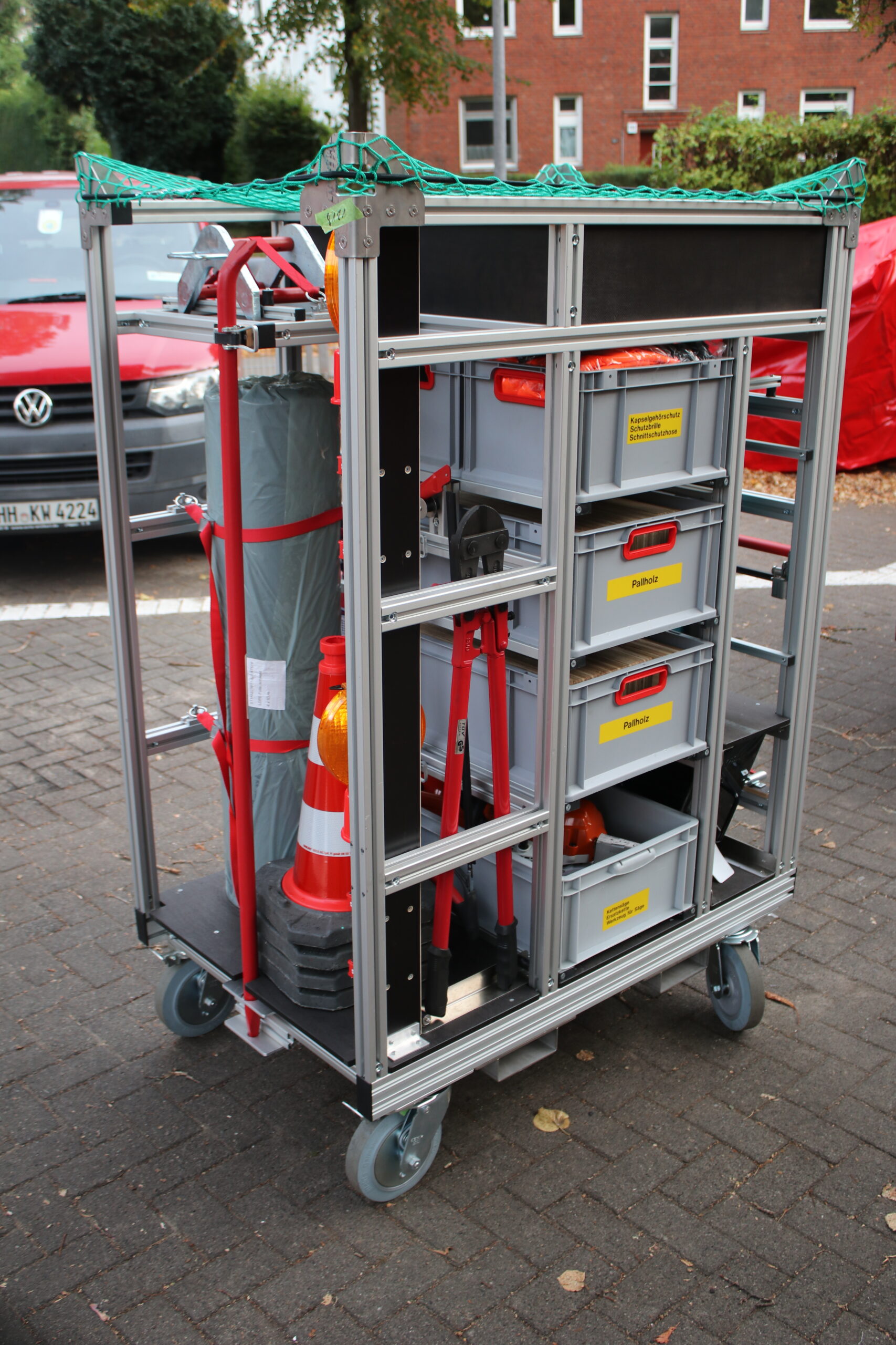 Beladung mit 3 rollbaren Gitterboxen mit Material für die technische Hilfeleistung wie z.B. Pump- und Lenzarbeiten sowie Beleuchtungssaufgaben.
