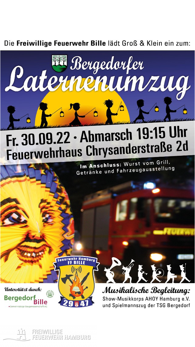 Daher sind Groß und Klein herzlichst eingeladen, mit ihren Laternen zum Gerätehaus der FF Bille zu kommen.