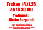 Laternenumzug mit Spielmannszug und der Freiwilligen Feuerwehr Bergstedt. Treffpunkt am 14.11.2025 um 16:30 Uhr an der Kirche Bergstedt. Für das leibliche Wohl ist gesorgt.